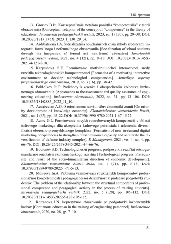 21. 	Романова, И.Н. Непрерывное образование при подготовке инженерных кадров / И.Н. Романова // Инженерное образование. - 2020. - № 28. - С. 7-10.