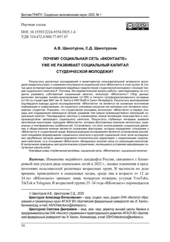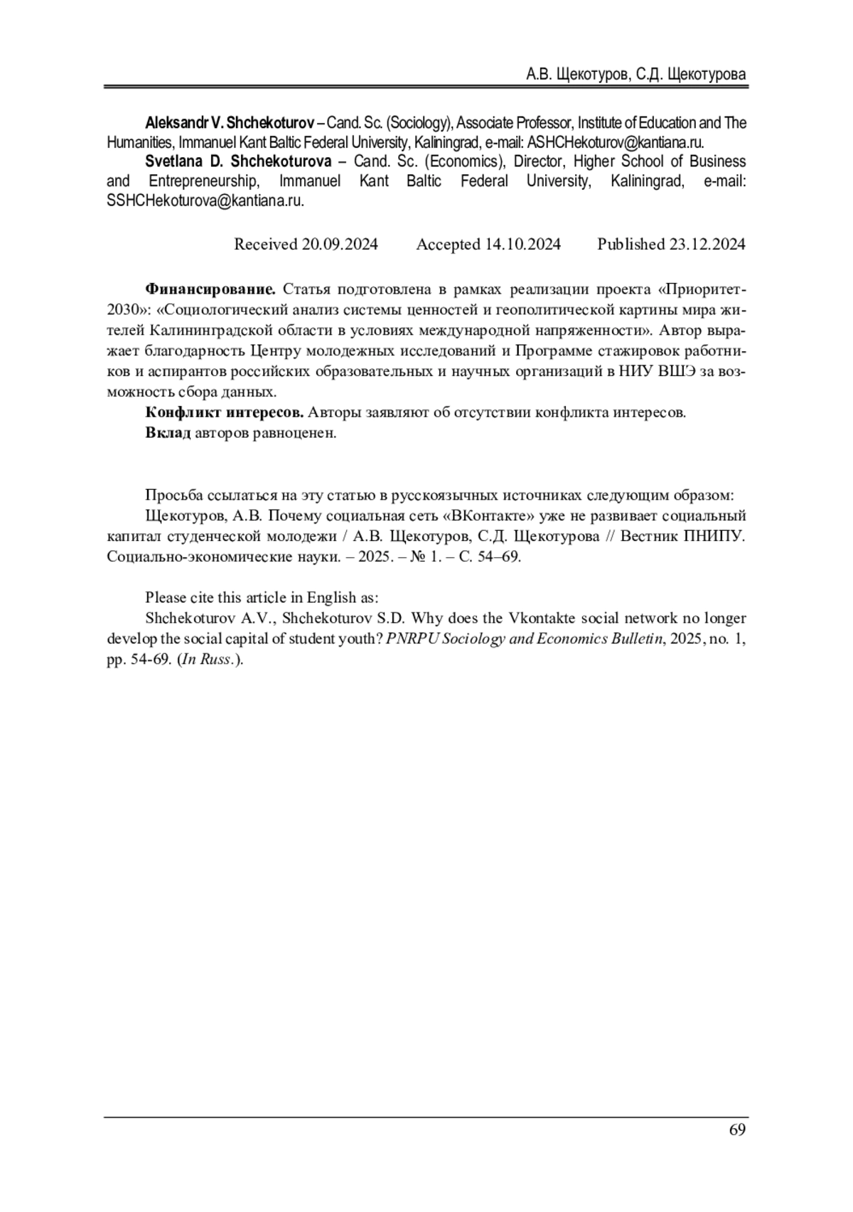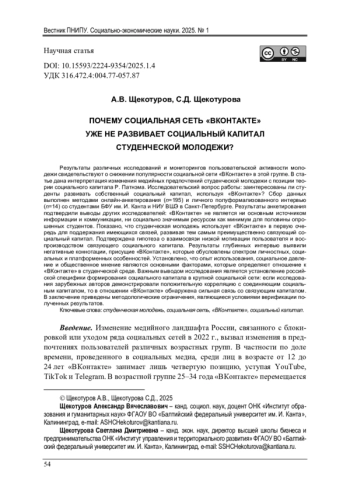 Результаты различных исследований и мониторингов пользовательской активности молодежи свидетельствуют о снижении популярности социальной сети «ВКонтакте» в этой группе. В статье дана интерпретация изменения медийных предпочтений студенческой молодежи с позиции теории социального капитала Р. Патнэма. Исследовательский вопрос работы: заинтересованы ли студенты развивать собственный социальный капитал, используя «ВКонтакте»? Сбор данных выполнен методами онлайн-анкетирования ( n =195) и личного полуформализованного интервью ( n =14) со студентами БФУ им. И. Канта и НИУ ВШЭ в Санкт-Петербурге. Результаты анкетирования подтвердили выводы других исследователей: «ВКонтакте» не является ни основным источником информации и коммуникации, ни социально значимым ресурсом как минимум для половины опрошенных студентов. Показано, что студенческая молодежь использует «ВКонтакте» в первую очередь для поддержания имеющихся связей, развивая тем самым преимущественно связующий социальный капитал. Подтверждена гипотеза о взаимосвязи низкой мотивации пользователя и воспроизводством связующего социального капитала. Результаты глубинных интервью выявили негативные коннотации, присущие «ВКонтакте», которые обусловлены спектром личностных, социальных и платформенных особенностей. Установлено, что опыт использования, социальное давление и общественное мнение являются основными факторами, которые определяют отношение к «ВКонтакте» в студенческой среде. Важным выводом исследования является установление российской специфики формирования социального капитала в крупной социальной сети: если исследования зарубежных авторов демонстрировали положительную корреляцию с соединяющим социальным капиталом, то в отношении «ВКонтакте» обнаружена сильная связь со связующим капиталом. В заключение приведены методологические ограничения, являющиеся условиями верификации полученных результатов.