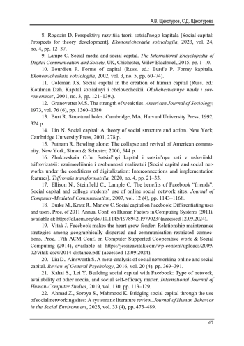 16. 	Жуковская, О.Ю. Социальный капитал и социальные сети в условиях цифровизации: взаимовлияние и особенности реализации / О.Ю. Жуковская // Цифровая трансформация. - 2020. - № 4. - С. 21-33.  EDN: SDYOIK