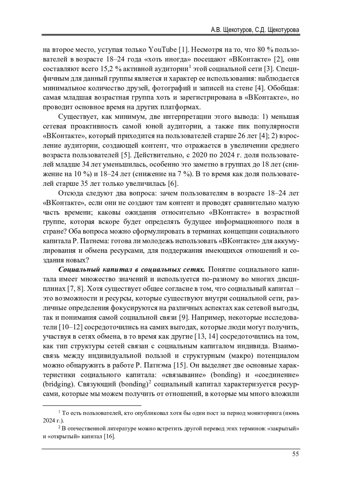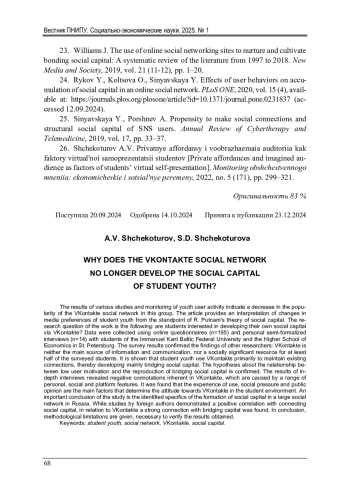 24. 	Rykov, Y. Effects of user behaviors on accumulation of social capital in an online social network / Y. Rykov, O. Koltsova, Y. Sinyavskaya // PLoS ONE. - 2020. - Vol. 15(4). - URL: https://journals.plos.org/plosone/article?id= (accessed 12 September 2024).  DOI: 10.1371/journal.pone.0231837  EDN: VSUKBK