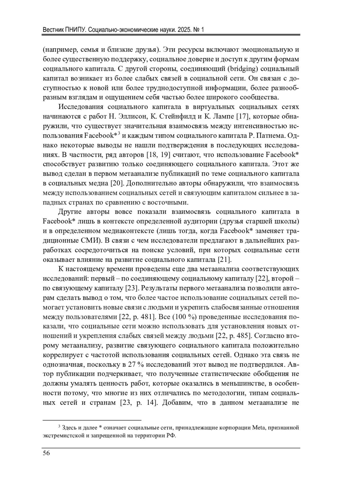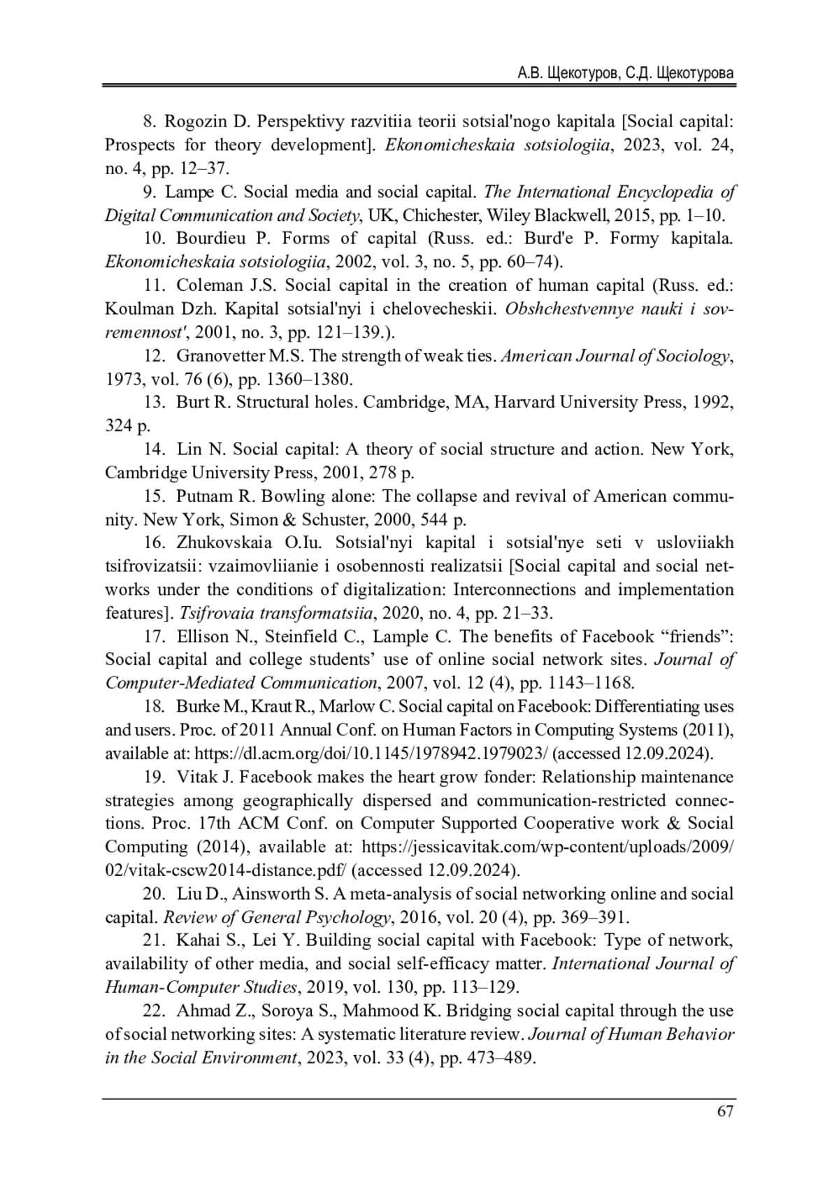 22. 	Ahmad, Z. Bridging social capital through the use of social networking sites: A systematic literature review / Z. Ahmad, S. Soroya, K. Mahmood // Journal of Human Behavior in the Social Environment. - 2023. - Vol. 33 (4). - P. 473-489.  EDN: OXWOXI
