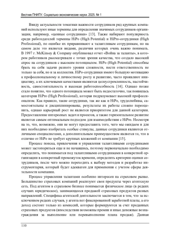 Ввиду высокой конкуренции на рынке (которая с каждым днем становится все более жесткой) и невероятной скорости развития технологий в настоящее время большинство компаний сталкивается с недостатком квалифицированного персонала, который является ключевой составляющей успеха бизнеса. Привлечение и удержание талантливых специалистов становится все более приоритетной задачей для руководителей и специалистов кадровых служб каждой отрасли. В статье исследуются вопросы определения понятия «талантливый сотрудник» в страховой отрасли и эффективности системы управления талантами в крупных страховых компаниях, которые входят в Топ-10 по доле рынка в России. В настоящее время сфера страхования стремительно развивается, предлагая выгодоприобретателям новые продукты с учетом их запросов и рисков и используя новые инструменты для более удобного распространения страховых продуктов. Однако успешность реализации страховых продуктов зависит напрямую от агента, ввиду чего поднимается вопрос о наличии таланта. В результате исследования определяется, что основными составляющими талантливого сотрудника являются демонстрация высоких результатов, наличие высокого потенциала к профессиональному росту, а также наличие желания развития в выбранной сфере деятельности. Исследование показало, что в настоящее время процесс управления талантами реализуется в каждой из рассматриваемых страховых компаний, однако во многих случаях поднимается вопрос качества, что говорит о том, что большинству компаний необходимо совершенствовать и актуализировать систему взаимодействия с талантами с учетом потребностей и желаний сотрудников, а также спецификой отрасли.