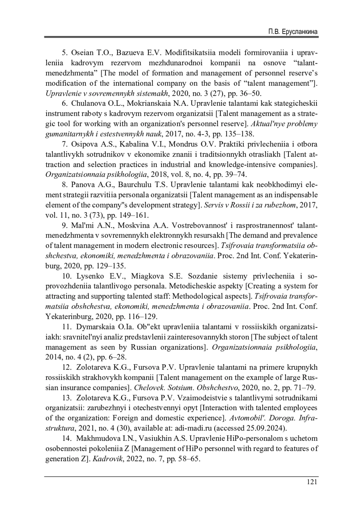 13. 	Золотарева, К.Г. Взаимодействие с талантливыми сотрудниками организации: зарубежный и отечественный опыт [Электронный ресурс] / К.Г. Золотарева, П.В. Фурсова // Автомобиль. Дорога. Инфраструктура. - 2021. - № 4(30). - URL: adi-madi.ru (дата обращения: 25.09.2024).  EDN: WELFMT