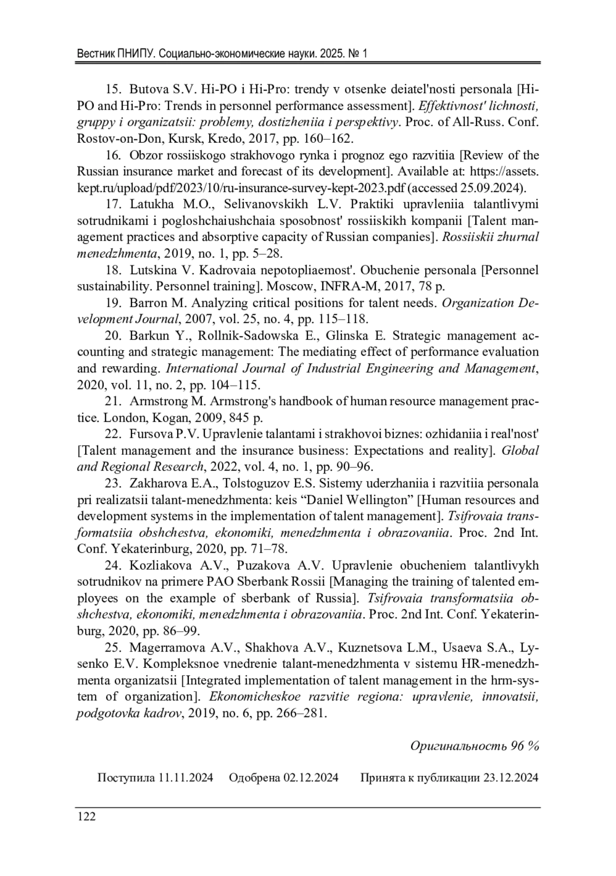 22. 	Фурсова, П.В. Управление талантами и страховой бизнес: ожидания и реальность / П.В. Фурсова // Global and Regional Research. - 2022. - Т. 4, № 1. - С. 90-96.  EDN: EMOHIJ
