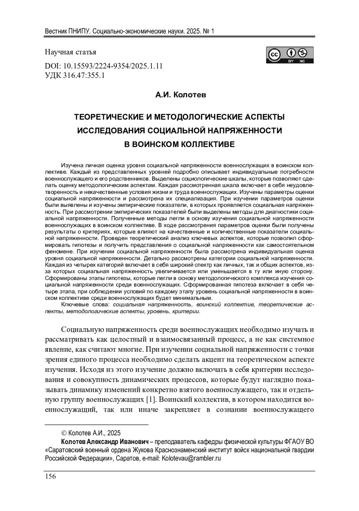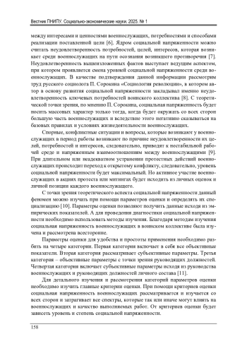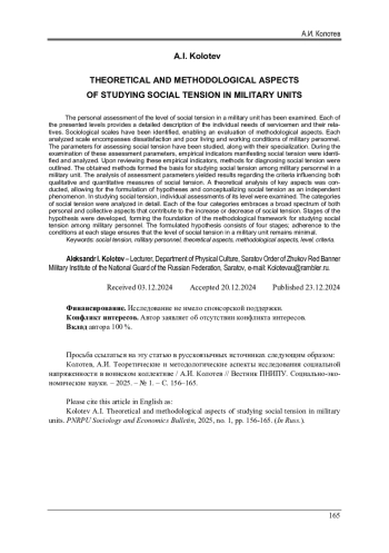 Изучена личная оценка уровня социальной напряженности военнослужащих в воинском коллективе. Каждый из представленных уровней подробно описывает индивидуальные потребности военнослужащего и его родственников. Выделены социологические шкалы, которые позволяют сделать оценку методологическим аспектам. Каждая рассмотренная шкала включает в себя неудовлетворенность и некачественные условия жизни и труда военнослужащих. Изучены параметры оценки социальной напряженности и рассмотрена их специализация. При изучении параметров оценки были выявлены и изучены эмпирические показатели, в которых проявляется социальная напряженность. При рассмотрении эмпирических показателей были выделены методы для диагностики социальной напряженности. Полученные методы легли в основу изучения социальной напряженности военнослужащих в воинском коллективе. В ходе рассмотрения параметров оценки были получены результаты о критериях, которые влияют на качественные и количественные показатели социальной напряженности. Проведен теоретический анализ ключевых аспектов, которые позволил сформировать гипотезы и получить представления о социальной напряженности как самостоятельном феномене. При изучении социальной напряженности была рассмотрена индивидуальная оценка уровня социальной напряженности. Детально рассмотрены категории социальной напряженности. Каждая из четырех категорий включает в себя широкий спектр как личных, так и общих аспектов, из-за которых социальная напряженность увеличивается или уменьшается в ту или иную сторону. Сформированы этапы гипотезы, которые легли в основу методологического комплекса изучения социальной напряженности среди военнослужащих. Сформированная гипотеза включает в себя четыре этапа, при соблюдении условий по каждому этапу уровень социальной напряженности в воинском коллективе среди военнослужащих будет минимальным.