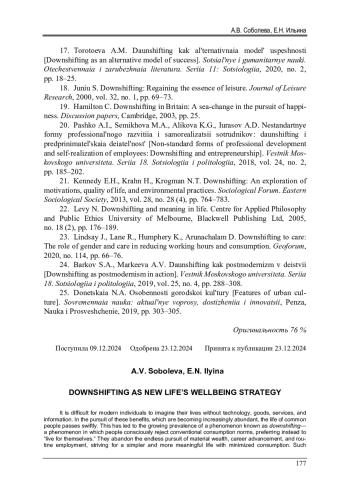 Современному человеку трудно представить свою жизнь без технологий, товаров, услуг и информации. В погоне за данными благами, которых становится все больше и больше, быстротечно проходит жизнь современного обывателя. Это приводит к тому, что последнее время все чаще наблюдается такое явление, как дауншифтинг - явление, при котором люди сознательно отвергают общепринятые нормы потребления, отдавая предпочтение «жизни для себя». Они отказываются от бесконечной погони за материальными благами, карьерным ростом и рутинной занятостью, стремясь к более простой и осмысленной жизни с минимизацией потребления. Такое поведение называется дауншифтингом и характеризуется добровольным переходом к упрощенному образу жизни. Дауншифтинг относится к феномену, при котором люди абсолютно добровольно стремятся к более простому образу жизни с сокращением потребления благ и услуг. Изучение дауншифтинга как стратегии жизненного благополучия является важной научной проблемой, которая позволит лучше понять динамику изменений на рынке труда, факторы, влияющие на карьерные решения людей и их установки, и последствия этих решений для их жизни и общества в целом. Переход от напряженной нервирующей работы в офисе к свободной занятости дома, при самостоятельном формировании рабочих графиков рассматривается с точки зрения возможности сохранить здоровье, укрепить семейные отношения, избежать выгорания и выстроить карьеру более гармонично. Целостное представление об особенностях дауншифтинга возможно составить при проведении исследования публикаций методом контент-анализа. Цель данного исследования - выявить отличительные признаки и черты дауншифтинга преимущественно в России, отраженные в социологических журналах.