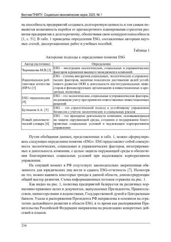 Само понятие ESG – это аббревиатура, включающая в себя три широких направления: экология, социум и управление. Понятие основывается на осознании того, что факторы, связанные с этими направлениями, оказывают влияние на способность предприятий создавать долгосрочную ценность и тем самым появляется возможность перейти от краткосрочного планирования стратегии развития предприятия к долгосрочному, обеспечивая свою конкурентоспособность [1, с. 51]. В табл. 1 приведены определения ESG, составленные авторами научных статей, диссертационных работ и учебных пособий