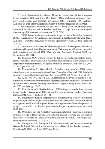 9. 	Измайлова, М.А. Реализация ESG-стратегий российских компаний в условиях санкционных ограничений / М.А. Измайлова // МИР (Модернизация. Инновации. Развитие). - 2022. - Т. 13, № 2. - С. 185-201.  EDN: BHXXJT