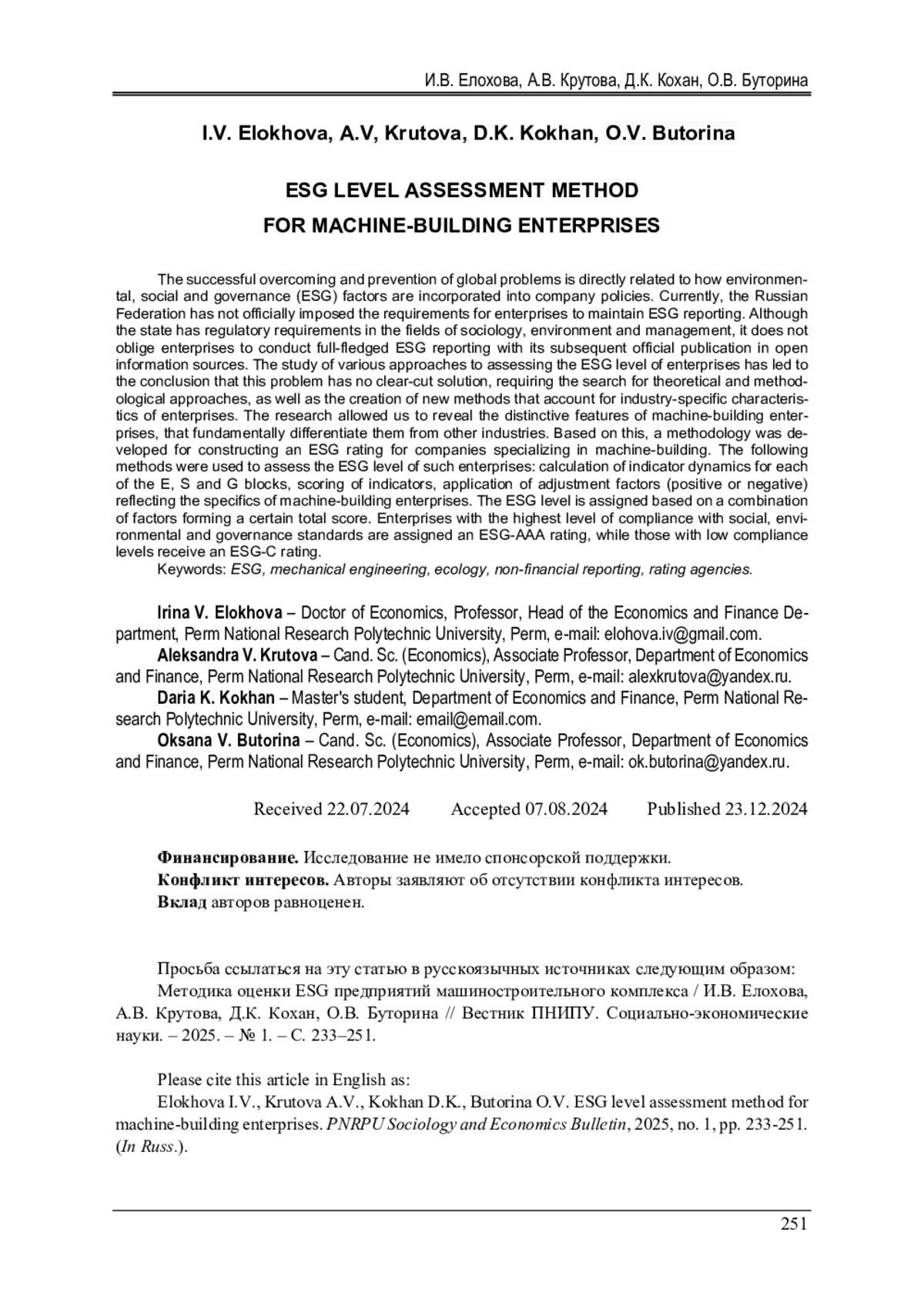 Успешное преодоление и предотвращение глобальных проблем напрямую связано с тем, как экологические, социальные и управленческие (environmental, social, governance (ESG)) факторы будут учитываться в политиках компаний. На текущий момент в Российской Федерации для предприятий не разработано официальной обязанности ведения ESG-отчетности. Однако в стране действуют нормативно-правовые требования в сфере социологии, окружающей среды и управления, но в целом они не обязывают предприятия вести полноценную ESG-отчетность с ее последующей официальной публикацией в открытых источниках информации. Изучение различных подходов к оценке уровня ESG предприятий позволило сделать вывод, что эта проблема не имеет единственного решения и нуждается в поиске теоретико-методических подходов, разработке новых методик, учитывающих отраслевую специфику предприятий. В ходе проведения исследования были выявлены особенности машиностроительных предприятий, принципиально отличающие их от других отраслей. На основе этого была разработана методика построения ESG-рейтинга для компаний, специализирующихся на машиностроении. Для оценки уровня ESG таких предприятий использовались следующие методы: расчет динамики показателей по каждому из блоков E, S и G, оценка показателей в баллах, а также корректировочные факторы (положительные или отрицательные), отражающие специфику машиностроительного предприятия. Уровень ESG присваивается из совокупности факторов, образующих определенную сумму баллов. Предприятиям, обладающим наивысшим уровнем соответствия социальным, экологическим, и управленческим стандартам присваивается рейтинг ESG-AAA, а предприятиям, обладающим низким уровнем соответствия экологическим, социальным и управленческим стандартам - ESG-С.
