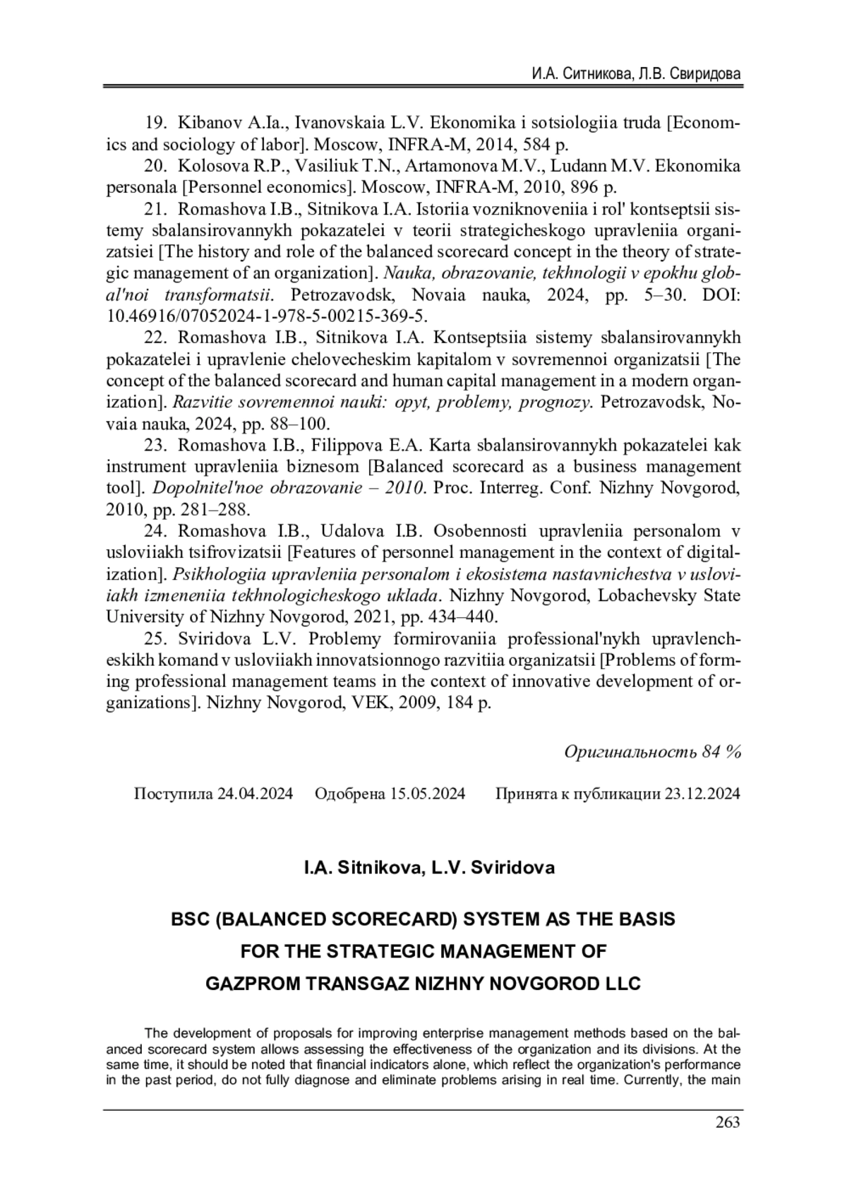 22. 	Ромашова, И.Б. Концепция системы сбалансированных показателей и управление человеческим капиталом в современной организации / И.Б. Ромашова, И.А. Ситникова // Развитие современной науки: опыт, проблемы, прогнозы: сб. ст. VII Междунар. науч.-практ. конф. (15 апреля 2024 г.). - Петрозаводск: Новая наука, 2024. - С. 88-100.  EDN: KAZYYO