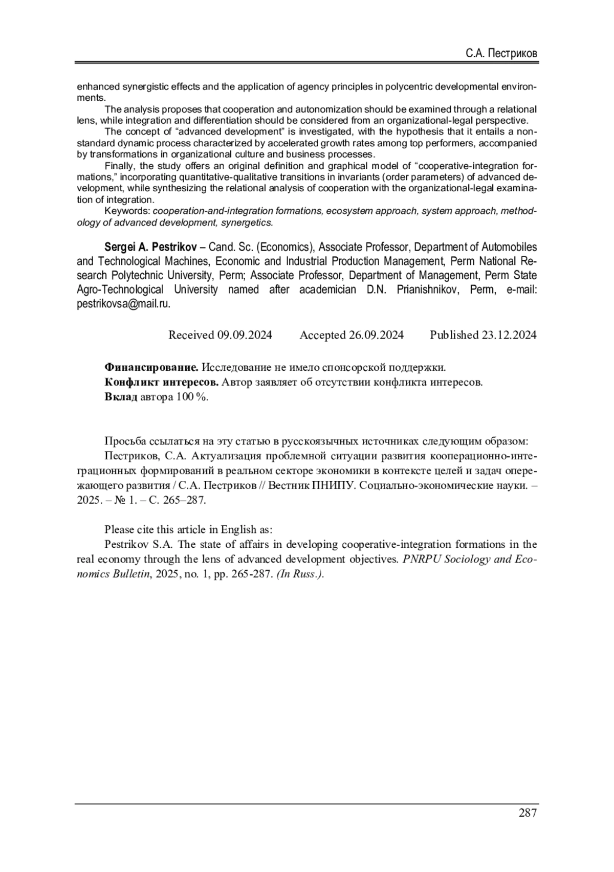 15. Пестриков, С.А. Природа возникновения кооперативных образований в аграрном секторе и их роль в социально-экономическом развитии экономики / С.А. Пестриков // Вестник Пермского национального исследовательского политехнического университета. Социально-экономические науки. - 2022. - № 3. - С. 259-278.