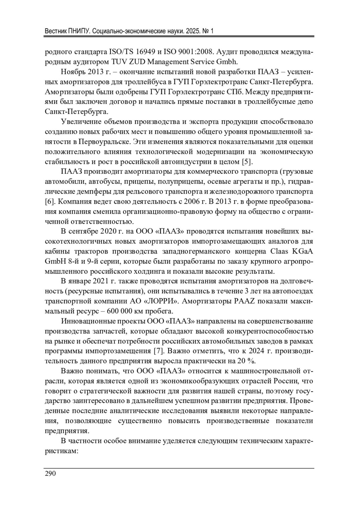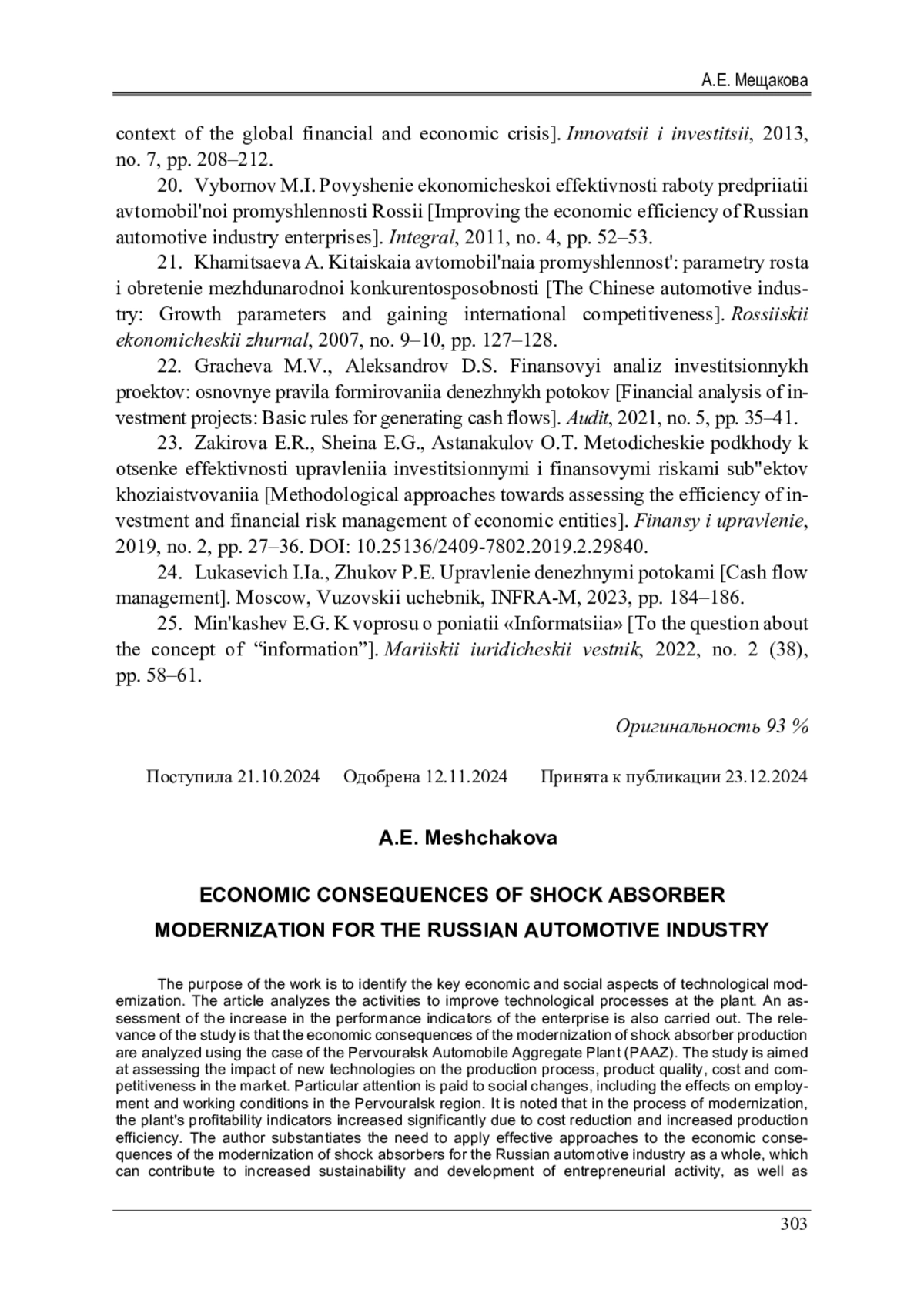 Анализируются мероприятия по совершенствованию технологических процессов на заводе. Проводится оценка повышения показателей эффективности деятельности предприятия. Актуальность исследования в том, что анализируются экономические последствия модернизации производства амортизаторов на примере Первоуральского автоагрегатного завода. Исследование направлено на оценку влияния внедрения новых технологий на производственный процесс, качество продукции, себестоимость и конкурентоспособность на рынке. Особое внимание уделено социальным изменениям, включая эффекты на уровень занятости и условия труда в регионе Первоуральска. Отмечается, что в процессе модернизации показатели рентабельности завода существенно выросли за счет сокращения затрат и повышения эффективности производства. Обоснована необходимость применения эффективных подходов к экономическим последствиям от модернизации амортизаторов для автоиндустрии России в целом, что может способствовать повышению устойчивости и развитию предпринимательской деятельности, а также оптимизации инвестиционных процессов в условиях повышенной неопределенности на данный момент времени. Разработаны некоторые рекомендации, повышающие конкурентоспособность завода, позволяющие адаптироваться к изменяющимся условиям на рынке.