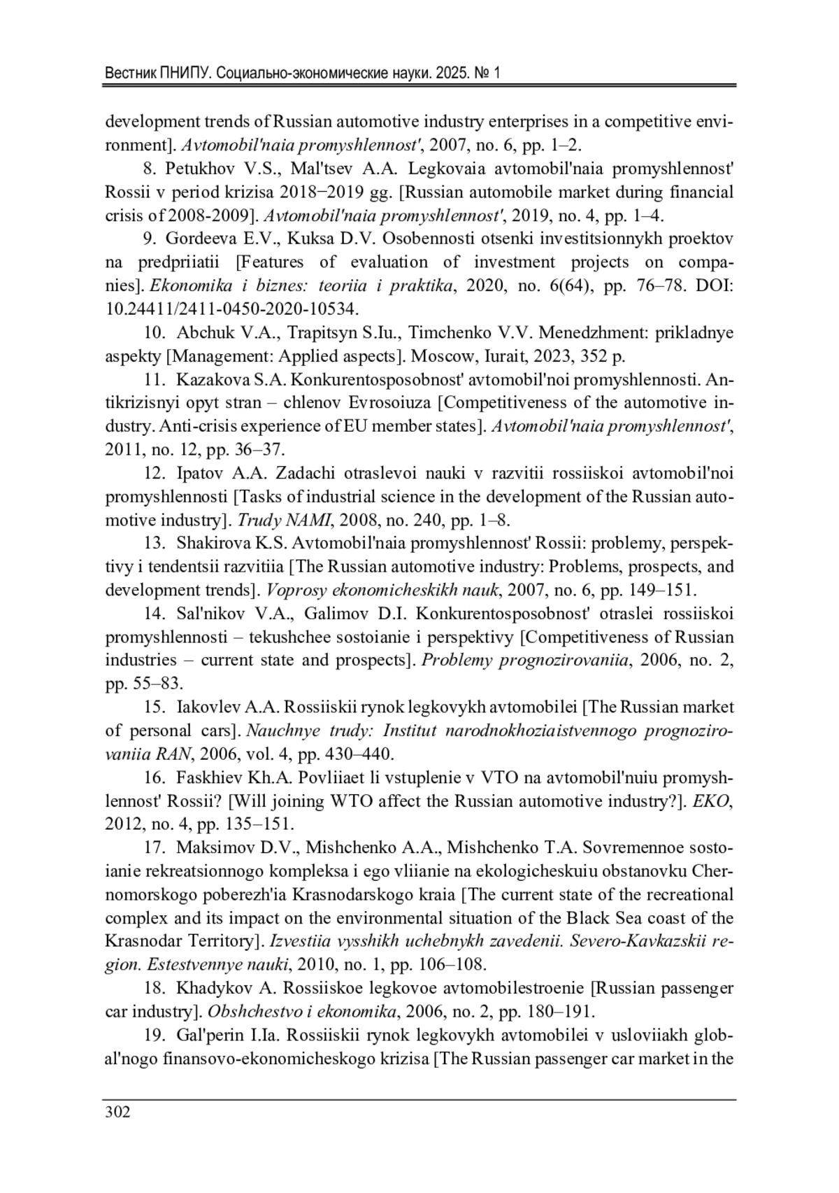 8. 	Петухов, В.С. Легковая автомобильная промышленность России в период кризиса 2018-2019 гг. / В.С. Петухов, А.А. Мальцев // Автомобильная промышленность. - 2019. - № 4. - С. 1-4.