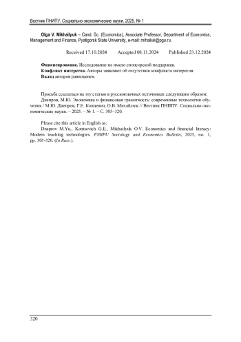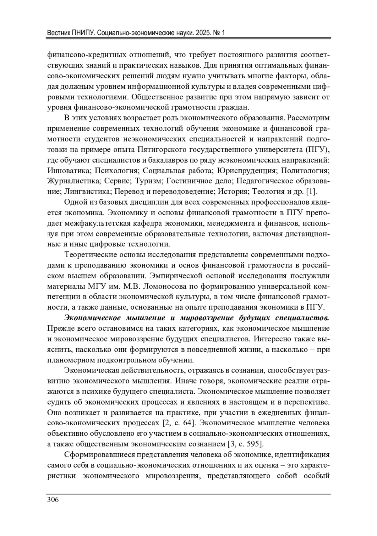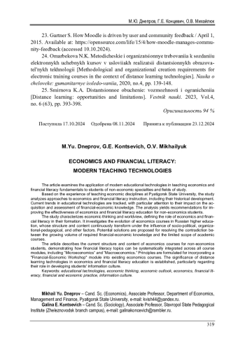 Рассматривается, как используются современные образовательные технологии в процессе обучения студентов неэкономических специальностей и направлений подготовки основам экономики и финансовой грамотности. На основе опыта преподавания экономических дисциплин в Пятигорском государственном университете проводится анализ подходов к преподаванию экономики и финансовой грамотности, а также их исторического развития. Отслеживаются тенденции в области образовательных технологий и их влияние на процессы освоения и контроля финансово-экономических знаний. На основе проведенного анализа предлагаются рекомендации по повышению эффективности обучения экономике и финансовой грамотности студентов неэкономических специальностей и направлений подготовки. Охарактеризовано экономическое мышление и мировоззрение, определена роль экономики и финансовой грамотности в их формировании. Исследовано развитие курса экономики в российском высшем образовании, структура и содержание которого перманентно трансформируется под влиянием общественно-политических, учебно-организационных и иных факторов. Намечены пути разрешения противоречия между возрастающим объемом необходимых финансово-экономических знаний и ограниченным объемом учебного курса. Описаны актуальная структура и содержание курса экономики для студентов неэкономических специальностей и направлений подготовки, позволяющие равномерно внедрить проблематику финансовой грамотности во все разделы курса, включая «Микроэкономику» и «Макроэкономику». Сформулированы принципы внедрения раздела «Финансово-экономический практикум» в существующий курс экономики. Определено значение дистанционных информационных технологий обучения экономике и финансовой грамотности в развитии информационной культуры обучающихся.