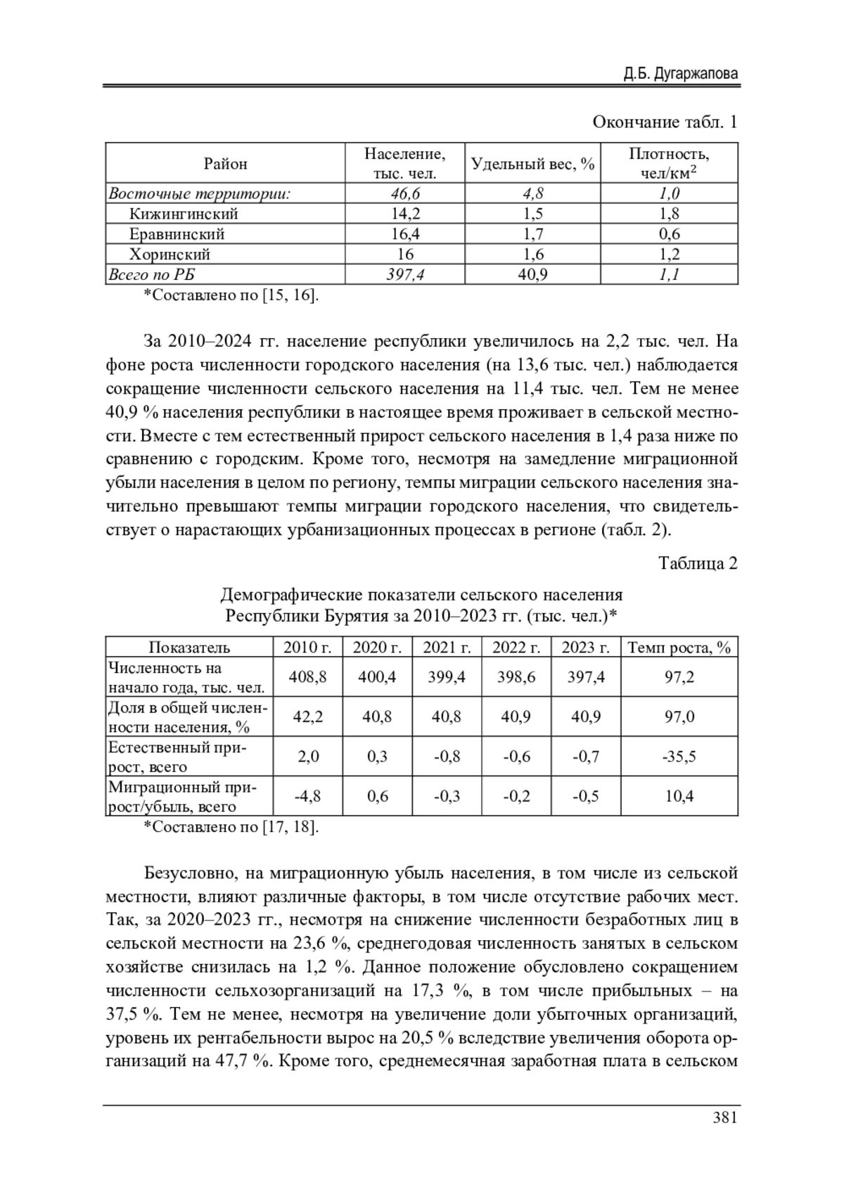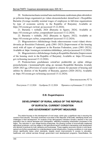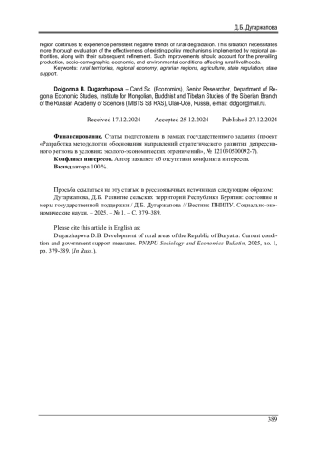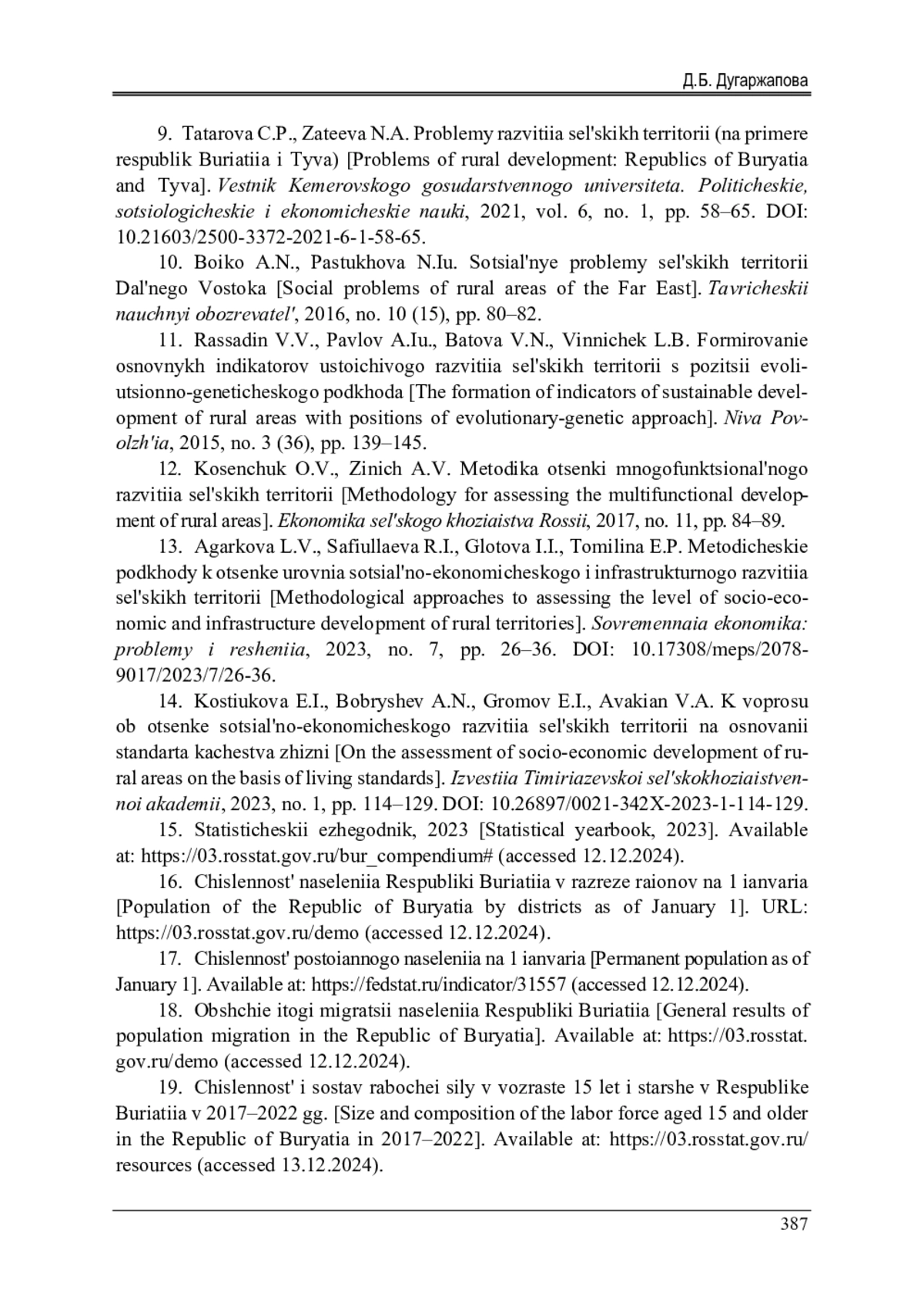 9. Татарова, C.П. Проблемы развития сельских территорий (на примере республик Бурятия и Тыва) / C.П. Татарова, Н.А. Затеева // Вестник Кемеровского государственного университета. Политические, социологические и экономические науки. - 2021. - Т. 6, № 1. - С. 58-65. DOI: 10.21603/2500-3372-2021-6-1-58-65