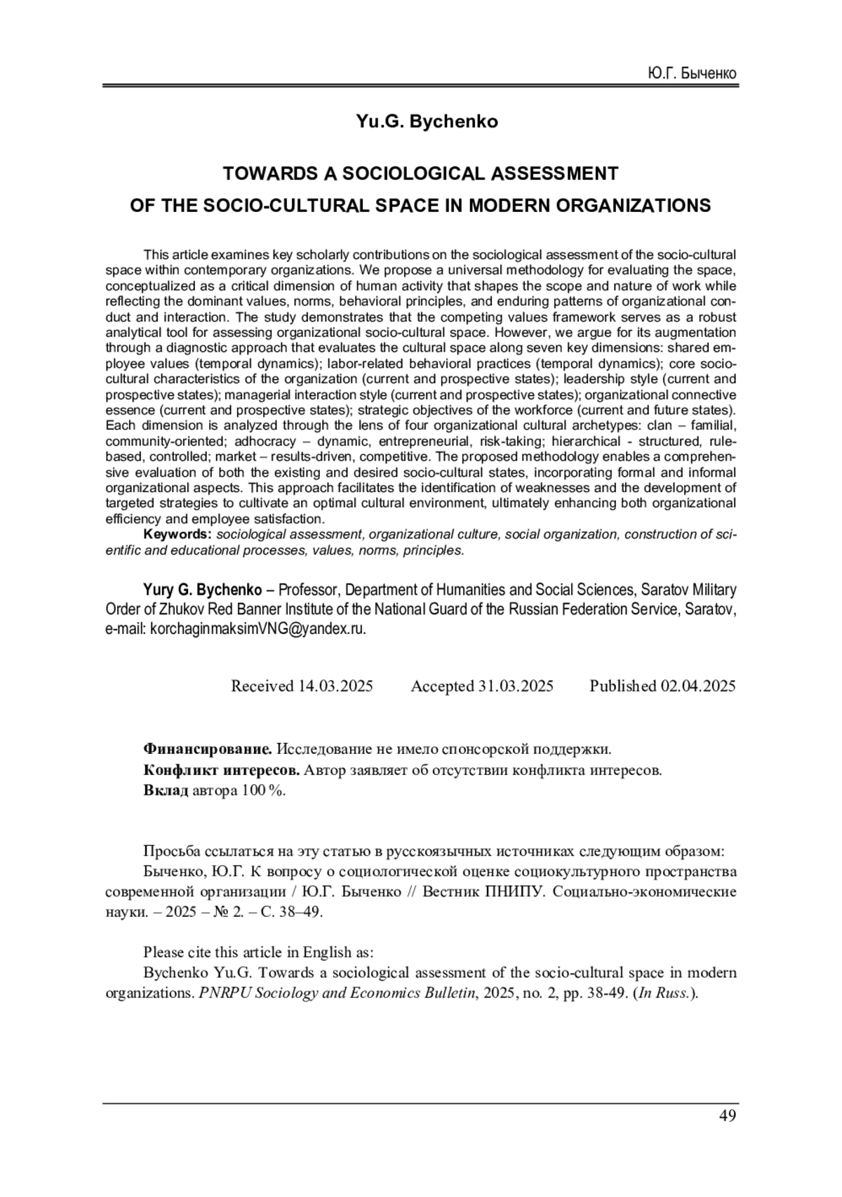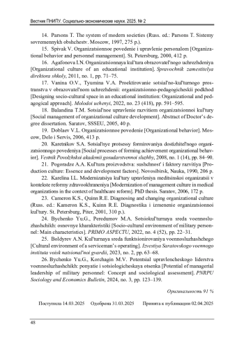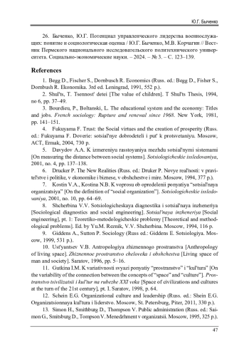 26. 	Быченко, Ю.Г. Потенциал управленческого лидерства военнослужащих: понятие и социологическая оценка / Ю.Г. Быченко, М.В. Корчагин // Вестник Пермского национального исследовательского политехнического университета. Социально-экономические науки. - 2024. - № 3. - С. 123-139.