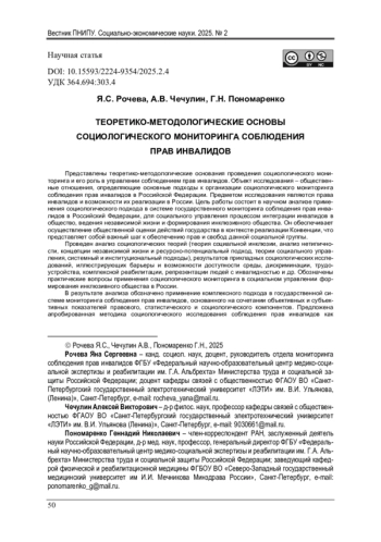8. 	Рочева, Я.С. Проблемы изучения социальной инклюзии инвалидов в современном обществе / Я.С. Рочева, А.Л. Шавонин // Социология. - 2024. - № 10. - С. 124-227.  DOI: 10.24412/1812-9226-2024-10-124-127