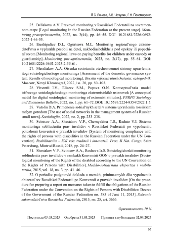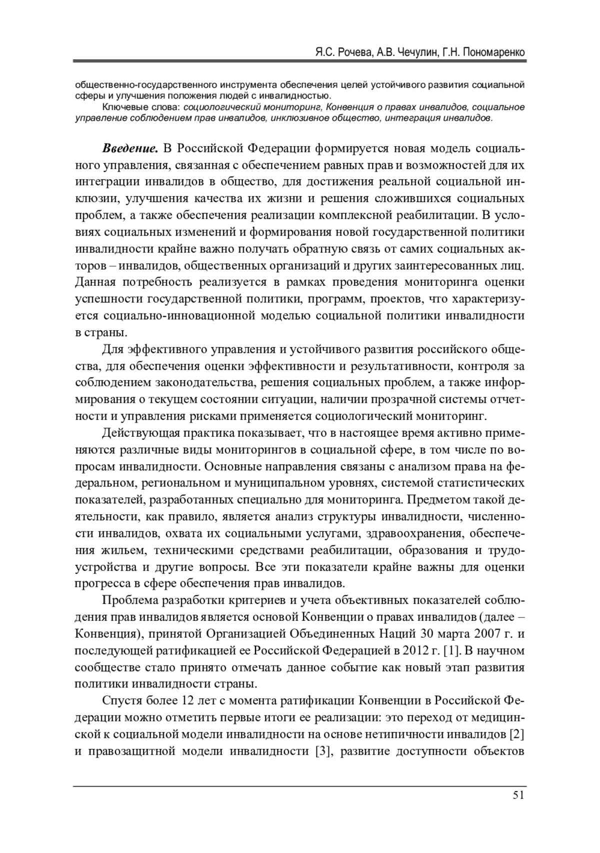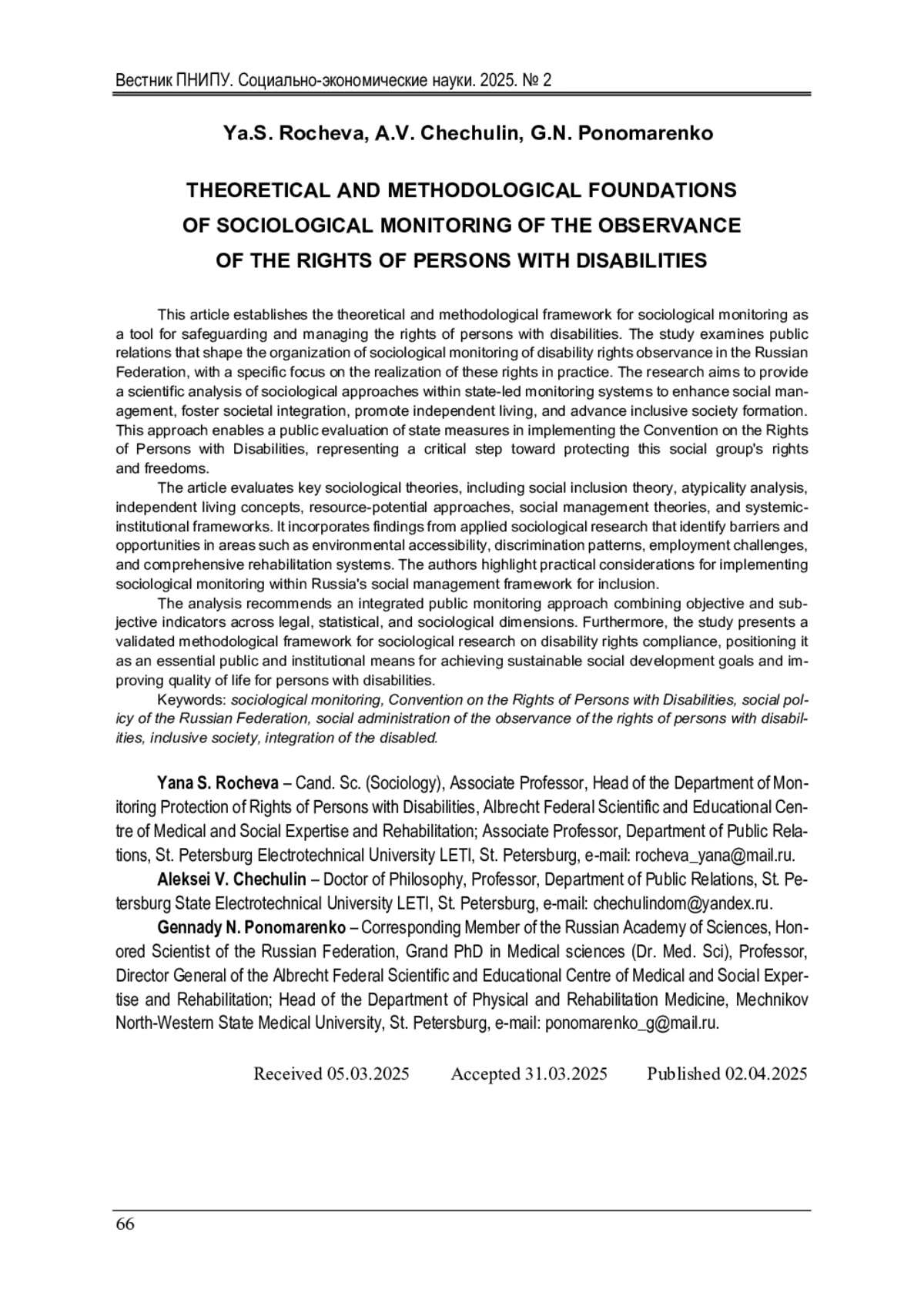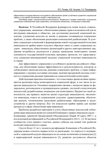31. 	Шестаков, В.П. Социологический мониторинг соблюдения прав инвалидов в рамках Конвенции ООН о правах инвалидов / В.П. Шестаков, А.А. Свинцов, Я.С. Рочева // Медико-социальная экспертиза и реабилитация. - 2015. - Т. 18, № 3. - С. 41-46.  EDN: UGIYUV