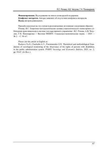 Представлены теоретико-методологические основания проведения социологического мониторинга и его роль в управлении соблюдением прав инвалидов. Объект исследования - общественные отношения, определяющие основные подходы к организации социологического мониторинга соблюдения прав инвалидов в Российской Федерации. Предметом исследования являются права инвалидов и возможности их реализации в России. Цель работы состоит в научном анализе применения социологического подхода в системе государственного мониторинга соблюдения прав инвалидов в Российский Федерации, для социального управления процессом интеграции инвалидов в общество, ведения независимой жизни и формирования инклюзивного общества. Он обеспечивает осуществление общественной оценки действий государства в контексте реализации Конвенции, что представляет собой важный шаг к обеспечению прав и свобод данной социальной группы. Проведен анализ социологических теорий (теория социальной инклюзии, анализ нетипичности, концепции независимой жизни и ресурсно-потенциальный подход, теории социального управления, системный и институциональный подходы), результатов прикладных социологических исследований, иллюстрирующих барьеры и возможности доступности среды, дискриминации, трудоустройства, комплексной реабилитации, репрезентации людей с инвалидностью и др. Обозначены практические вопросы применения социологического мониторинга в социальном управлении формирования инклюзивного общества в России. В результате анализа обозначено применение комплексного подхода в государственной системе мониторинга соблюдения прав инвалидов, основанного на сочетании объективных и субъективных показателей правового, статистического и социологического компонентов. Предложена апробированная методика социологического исследования соблюдения прав инвалидов как общественно-государственного инструмента обеспечения целей устойчивого развития социальной сферы и улучшения положения людей с инвалидностью.