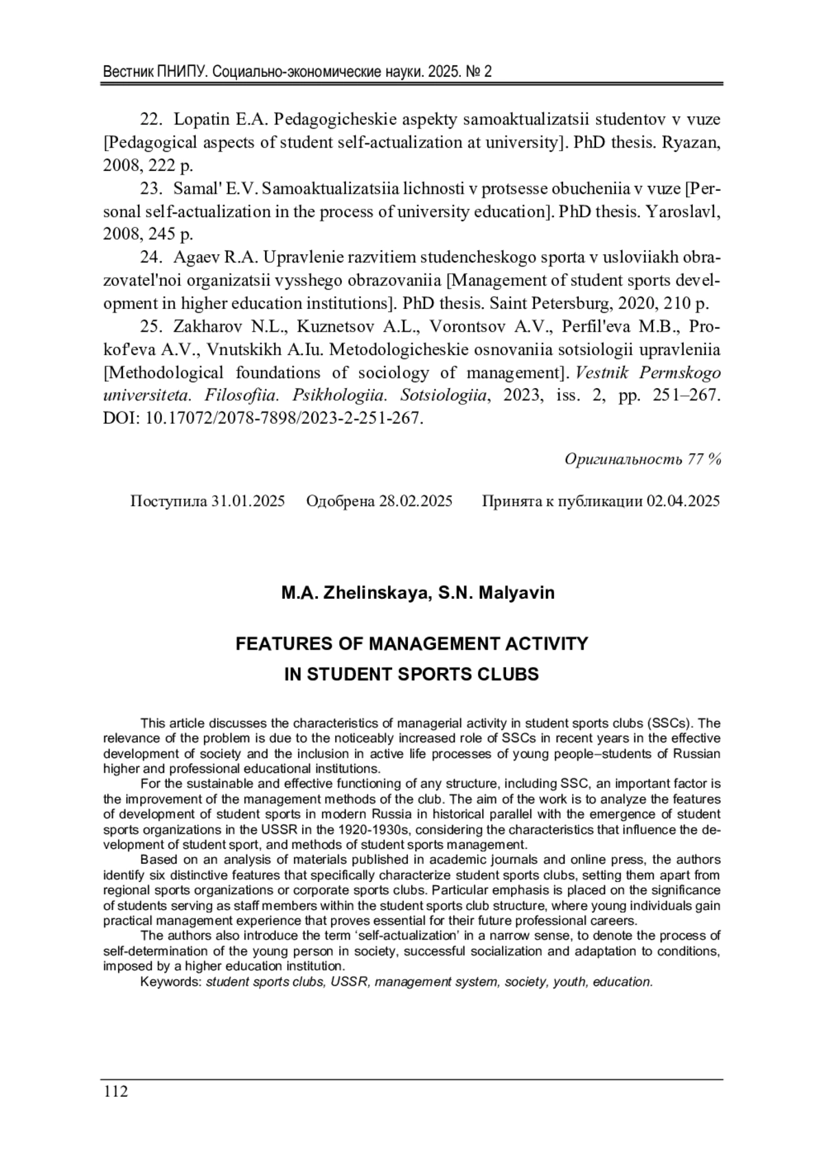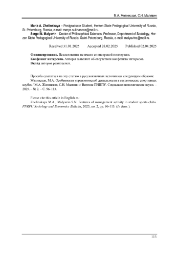 Рассмотрены особенности управленческой деятельности в студенческих спортивных клубах (СКК). Актуальность проблемы обусловлена заметно возросшей в последние несколько лет ролью СКК в деле эффективного развития общества и вовлечения в активные жизненные процессы молодежи, получающей образование в высших и профессиональных учебных заведениях России. Для устойчивого и эффективного функционирования любой структуры, в том числе и СКК, важным фактором является совершенствование методов управления клубом. Целью работы является анализ особенностей развития студенческого спорта в современной России в исторической параллели с опытом возникновения студенческих спортивных организаций в СССР в 20-30-х гг. ХХ в., рассмотрение факторов, влияющих на развитие студенческого спорта, методов управления ССК, а также изучение недостатков в этой сфере. Анализируется нормативно-правовая база, регулирующая вопросы функционирования ССК на государственном уровне. На основе исследования опубликованных в научных журналах и ЭСМИ материалов авторы выделяют шесть особенностей, отличающих работу именно студенческих спортивных клубов от региональных спортивных организаций или спортивных клубов при промышленных предприятиях. Отдельно подчеркивается важность работы студента в качестве функционера в структуре ССК, где молодой человек получает практический опыт управленческой деятельности, крайне необходимый в дальнейшей профессиональной деятельности. Авторами вводится в оборот термин «самоактуализация» в узком смысле, под которой понимается процесс самоопределения молодого человека в обществе, его успешной социализации и адаптации к условиям, в которые он поставлен в процессе обучения в высшем учебном заведении.
