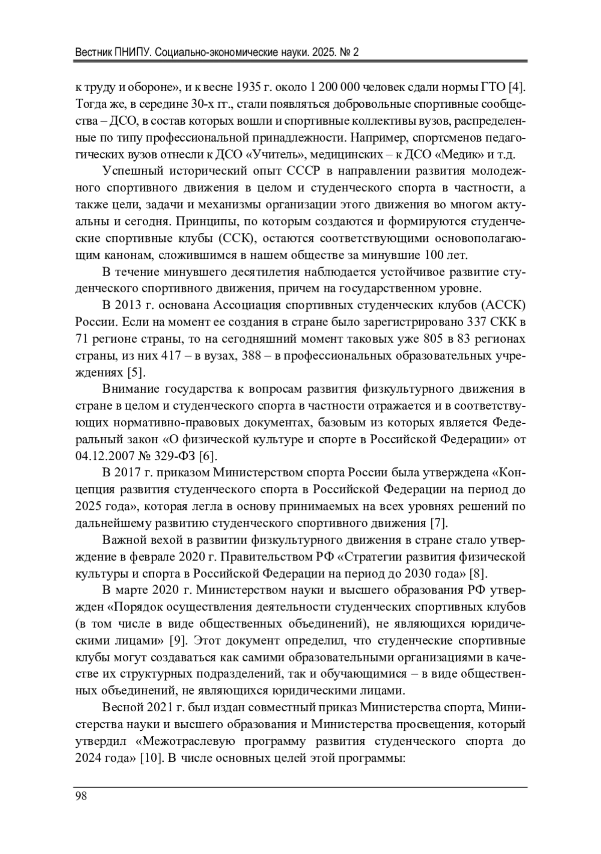 10. 	Межотраслевая программа развития студенческого спорта до 2024 года: утв. Приказом М-ва спорта РФ, М-ва науки и высшего образования РФ и М-ва просвещения РФ от 9 марта 2021 г. № 141/167/90 // Электронный фонд правовых и нормативно-технических документов. - URL: https://docs.cntd.ru/document/573857442?ysclid=m7ecwh31qx911695471 (дата обращения: 12.01.2025).