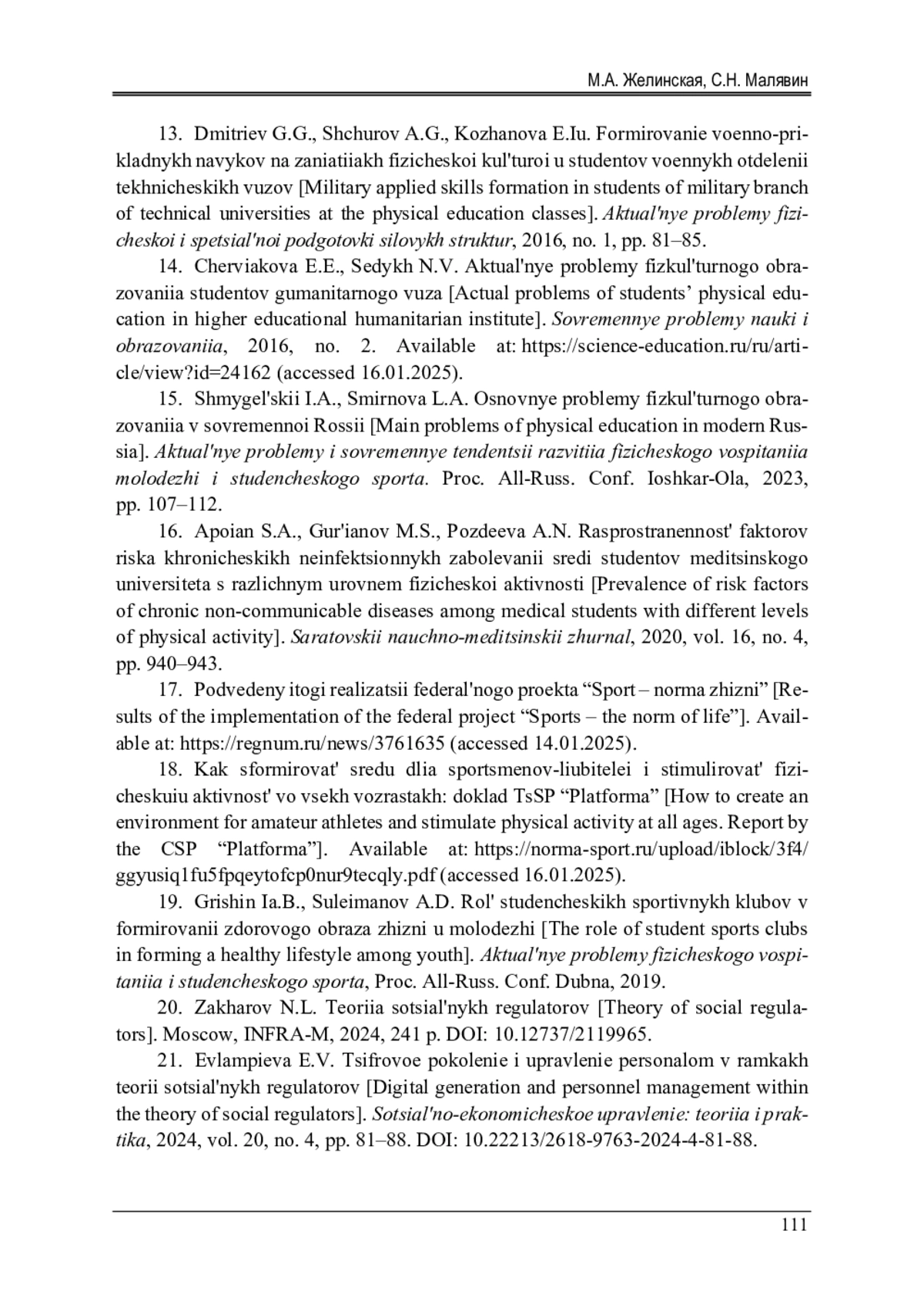 14. 	Червякова, Е.Э. Актуальные проблемы физкультурного образования студентов гуманитарного вуза [Электронный ресурс] / Е.Э. Червякова, Н.В. Седых // Современные проблемы науки и образования. - 2016. - № 2. - URL: https://science-education.ru/ru/article/view?id=24162 (дата обращения: 16.01.2025).  EDN: VUCWQD