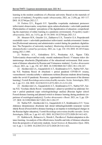 27. Distance learning in a pandemic: the experience of sociological monitoring of students in Russia and Kazakhstan / T.A. Dautova, I.V. Frolova, O. Khristodulo, T. Rezvushkina // SHS Web of Conferences: XI International Conference on Aerospace Education and Staffing for High-Tech Enterprises (AESHE 2021). - Alushta: EDP Sciences, 2022. - Vol. 137. - P. 01002. DOI: 10.1051/shsconf/202213701002 EDN: VUHYRG