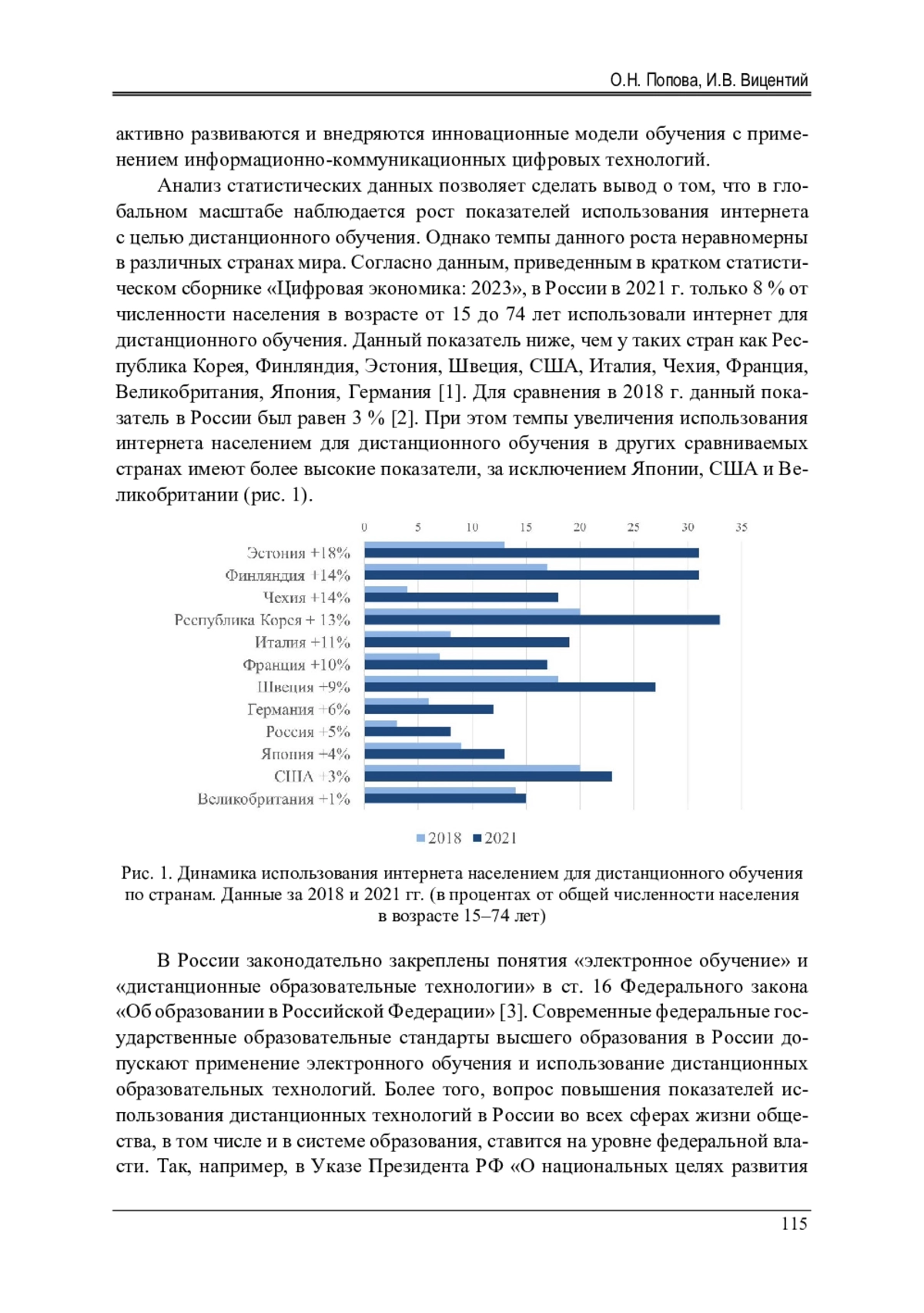 Анализ статистических данных позволяет сделать вывод о том, что в глобальном масштабе наблюдается рост показателей использования интернета с целью дистанционного обучения. Однако темпы данного роста неравномерны в различных странах мира. Согласно данным, приведенным в кратком статистическом сборнике «Цифровая экономика: 2023», в России в 2021 г. только 8 % от численности населения в возрасте от 15 до 74 лет использовали интернет для дистанционного обучения. Данный показатель ниже, чем у таких стран как Республика Корея, Финляндия, Эстония, Швеция, США, Италия, Чехия, Франция, Великобритания, Япония, Германия [1]. Для сравнения в 2018 г. данный показатель в России был равен 3 % [2]. При этом темпы увеличения использования интернета населением для дистанционного обучения в других сравниваемых странах имеют более высокие показатели, за исключением Японии, США и Великобритании