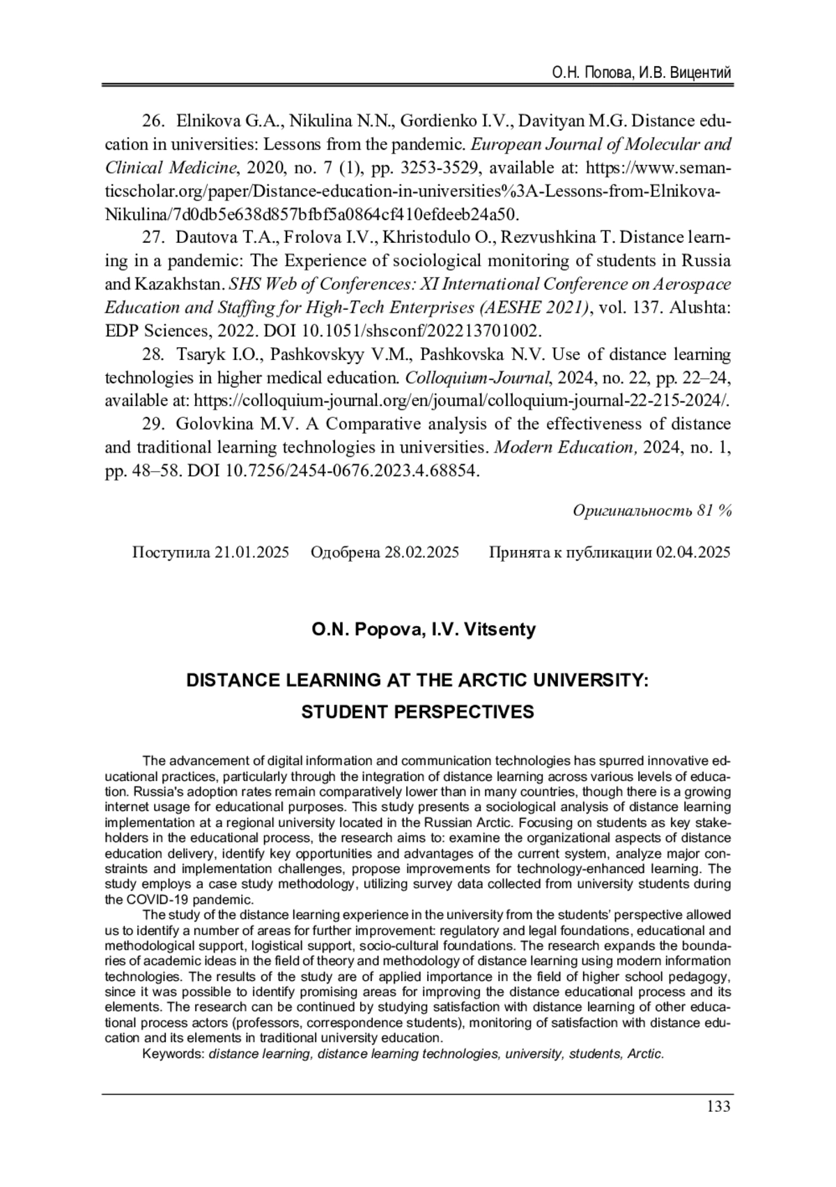 26. Distance education in universities: Lessons from the pandemic / G.A. Elnikova, N.N. Nikulina, I.V. Gordienko, M.G. Davityan // European Journal of Molecular and Clinical Medicine. - 2020. - № 7 (1). - P. 3253-3529. EDN: GWWFUO