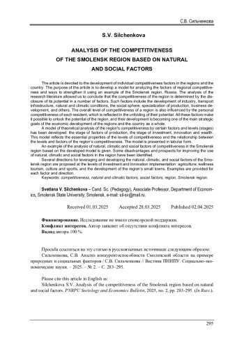 1. Кузнецова, Э.Р. Сущность и экономическое содержание понятия “конкурентоспособность региона” / Э.Р. Кузнецова, Э.М. Радостева // Интернет-журнал “Науковедение”. - 2015. - Т. 7, № 5. - URL: http://naukovedenie.ru/PDF/60EVN515.pdf (дата обращения: 19.02.2025). DOI: 10.15862/60EVN515 EDN: VJKPQD