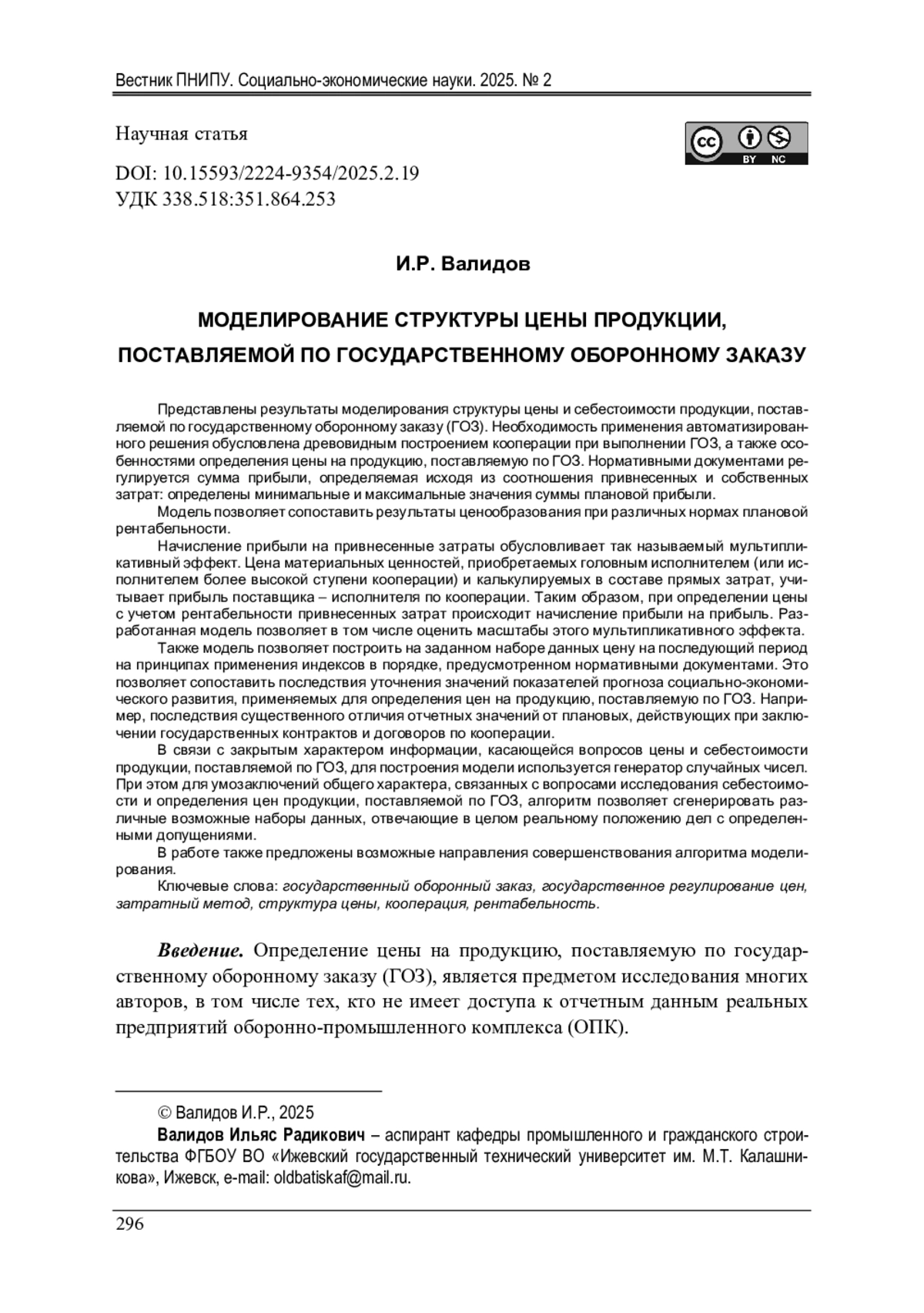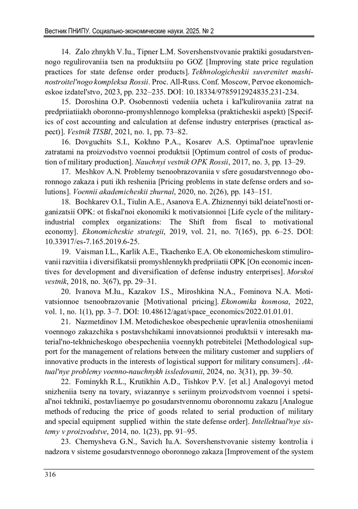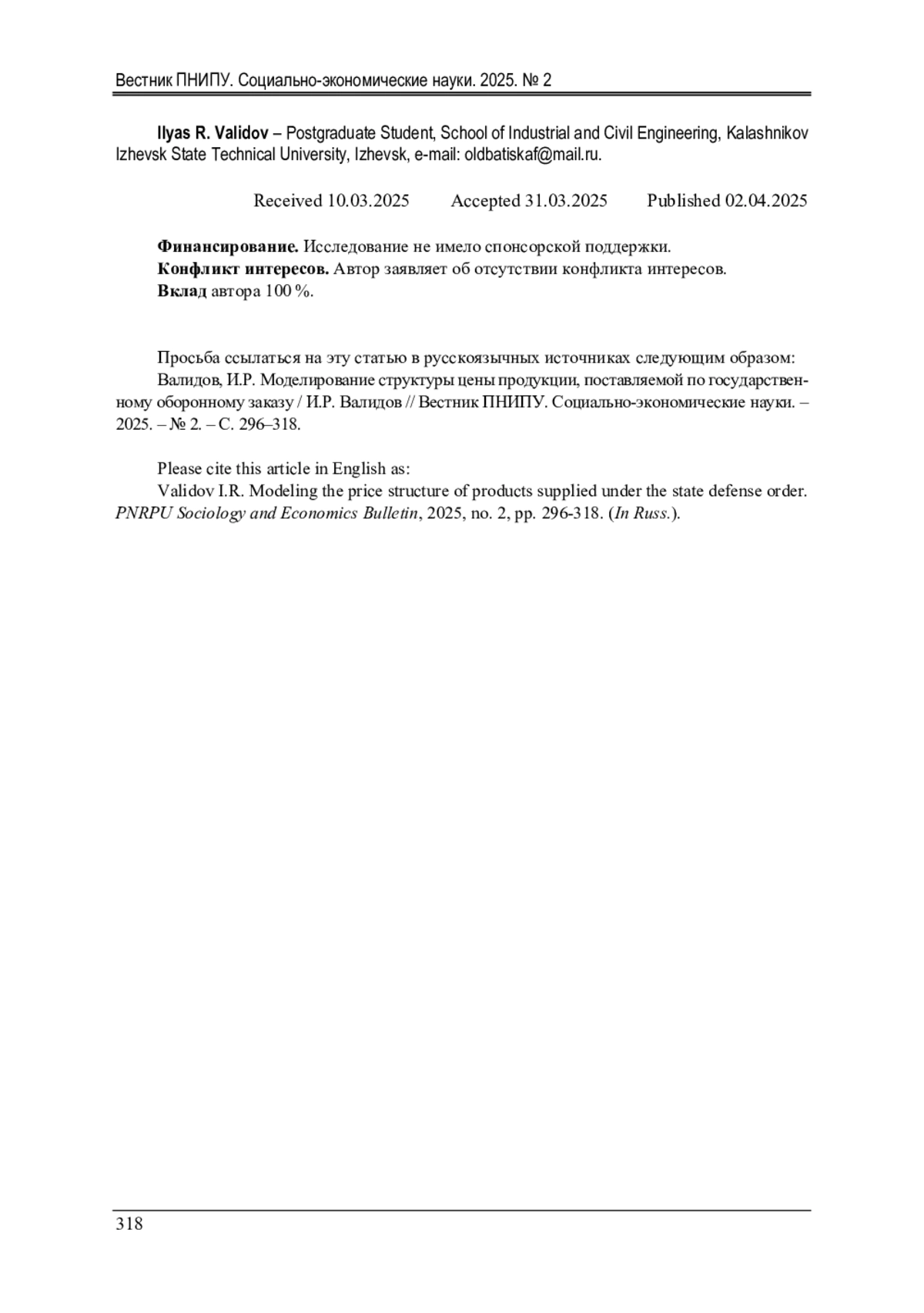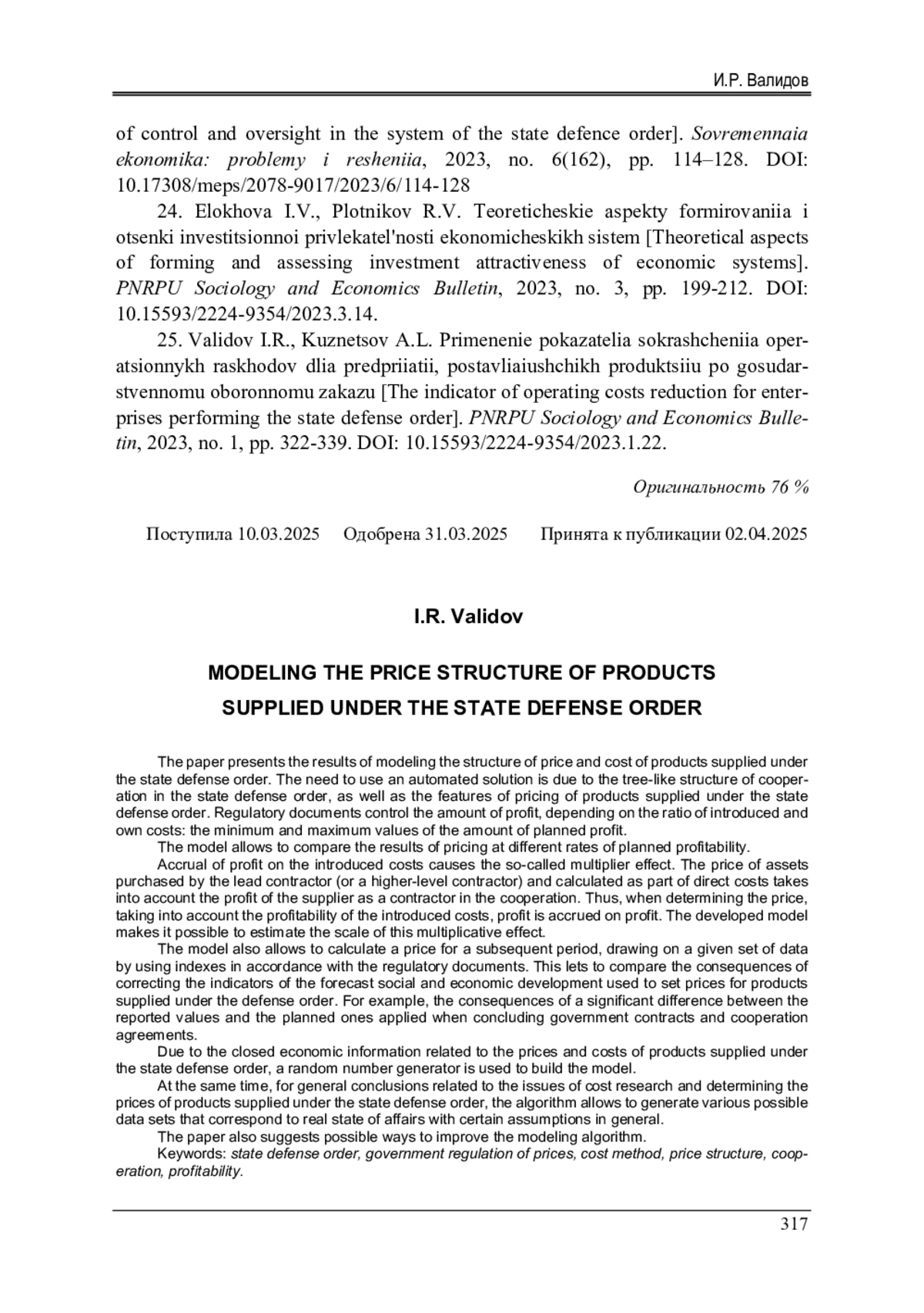 25. Валидов, И.Р. Применение показателя сокращения операционных расходов для предприятий, поставляющих продукцию по государственному оборонному заказу / И.Р. Валидов, А.Л. Кузнецов // Вестник Пермского национального исследовательского политехнического университета. Социально-экономические науки. - 2023. - № 1. - С. 322-339. DOI: 10.15593/2224-9354/2023.1.22