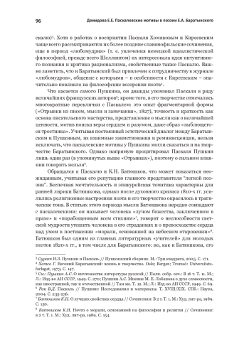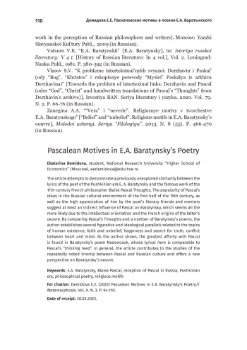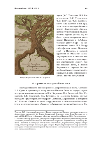 В статье делается попытка продемонстрировать ранее не исследованное сходство между лирикой «поэта пушкинской поры» Е. А. Баратынского и знаменитым трудом французского философа XVII века Блеза Паскаля «Мысли». Популярность идей Паскаля в русской культурной среде первой половины XIX века, а также его высокая оценка литературными друзьями и наставниками поэта позволяют допустить как минимум опосредованное влияние Паскаля на Баратынского, тем более вероятное в связи с интеллектуальной направленностью и французскими истоками творчества последнего. Сопоставляя «Мысли» Паскаля и ряд стихотворений Баратынского, автор устанавливает несколько образных и мировоззренческих параллелей, относящихся к темам человеческого существования, веры и безверия, счастья и поиска истины, противостояния между сердцем и разумом. Как показывает автор, наибольшее сходство с Паскалем Баратынский обнаруживает в стихотворении «Недоносок», лирический герой которого сопоставим с паскалевским «мыслящим тростником». В целом статья вносит вклад в изучение неоднократно отмеченного родства между Паскалем и русской культурой, а также предлагает взглянуть на творчество Баратынского с новой стороны.