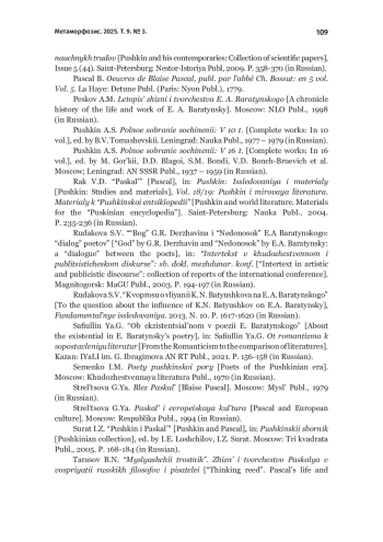 19. 	Рудакова С.В. К вопросу о влиянии К. Н. Батюшкова на Е. А. Баратынского // Фундаментальные исследования. 2013. №. 10. С. 1617-1620. EDN: RKPSUJ