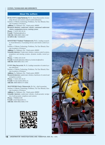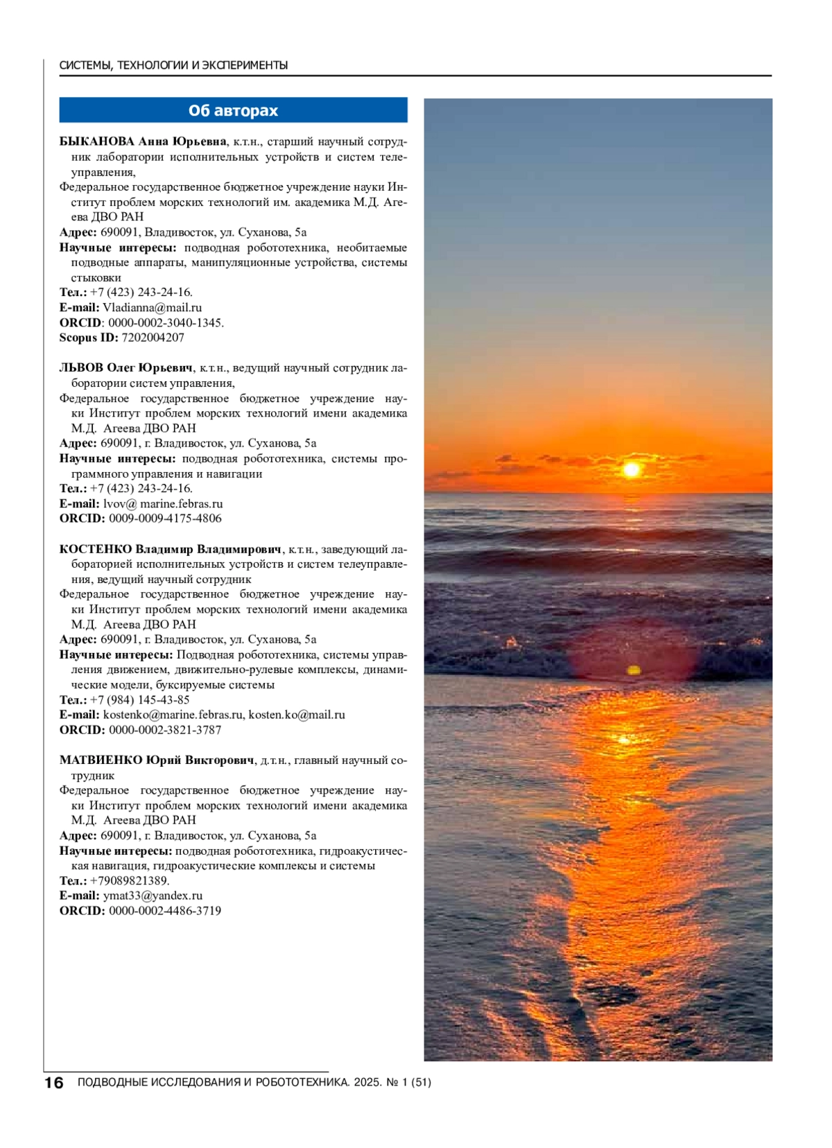 9. 	Костенко В.В., Толстоногов А.Ю. Управление глубиной погружения необитаемого подводного аппарата, оснащенного системой регулирования плавучести // Подводные исследования и робототехника. 2019. № 1 (27). С. 4-11.