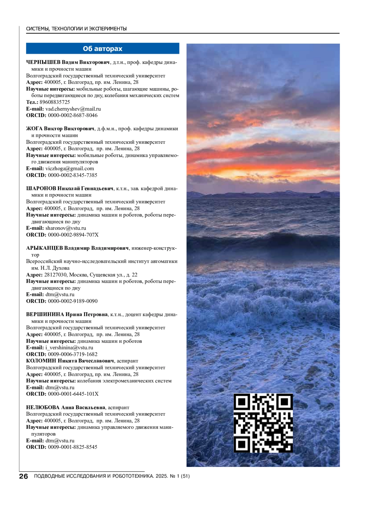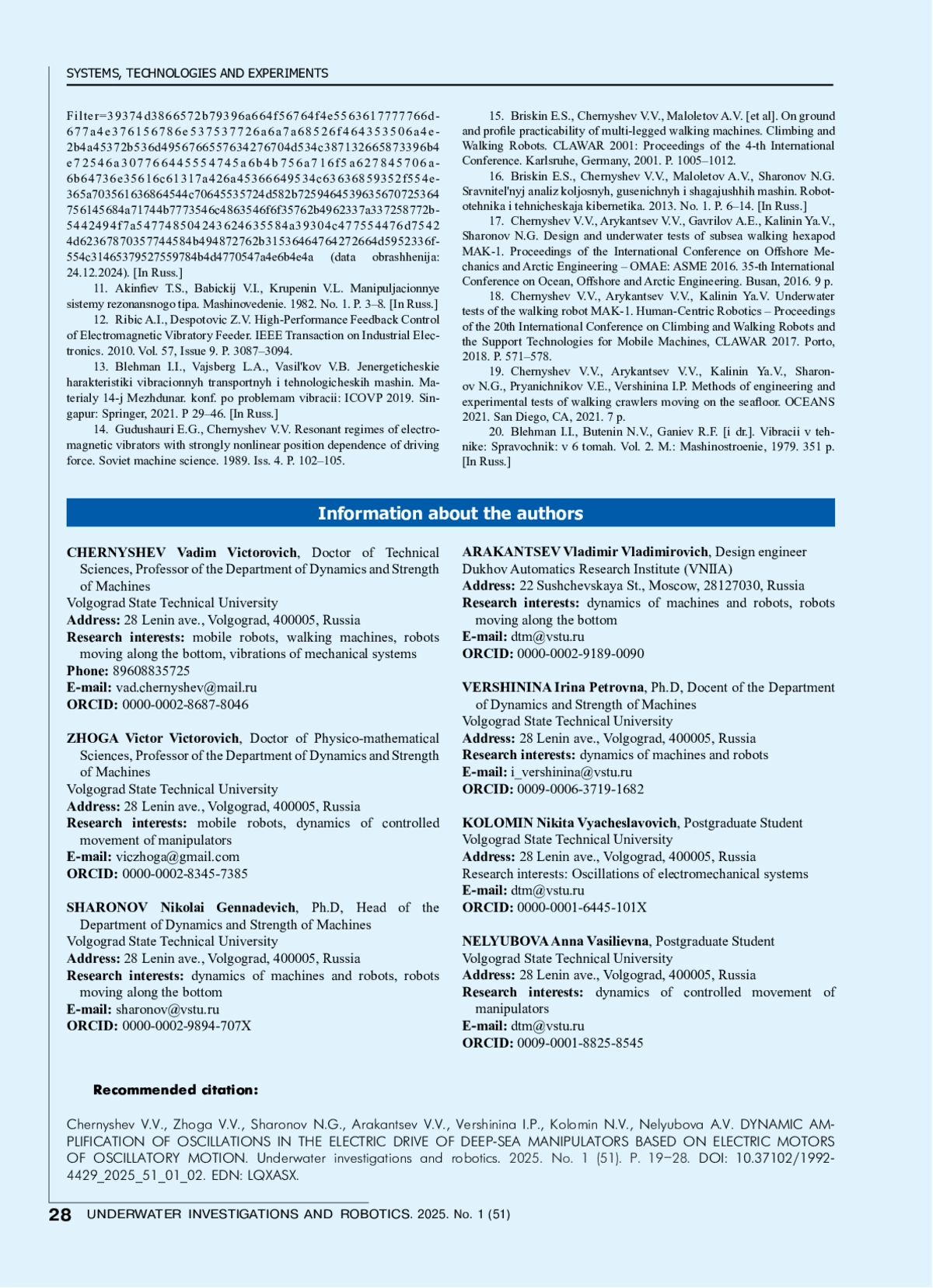 19. 	Chernyshev V.V., Arykantsev V.V., Kalinin Ya.V., Sharonov N.G., Pryanichnikov V.E., Vershinina I.P. Methods of engineering and experimental tests of walking crawlers moving on the seafloor // OCEANS 2021. San Diego, CA, 2021. 7 p.