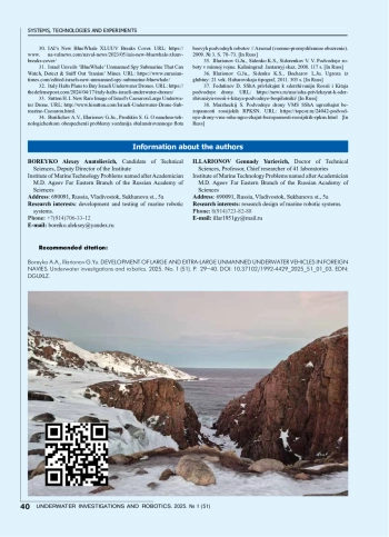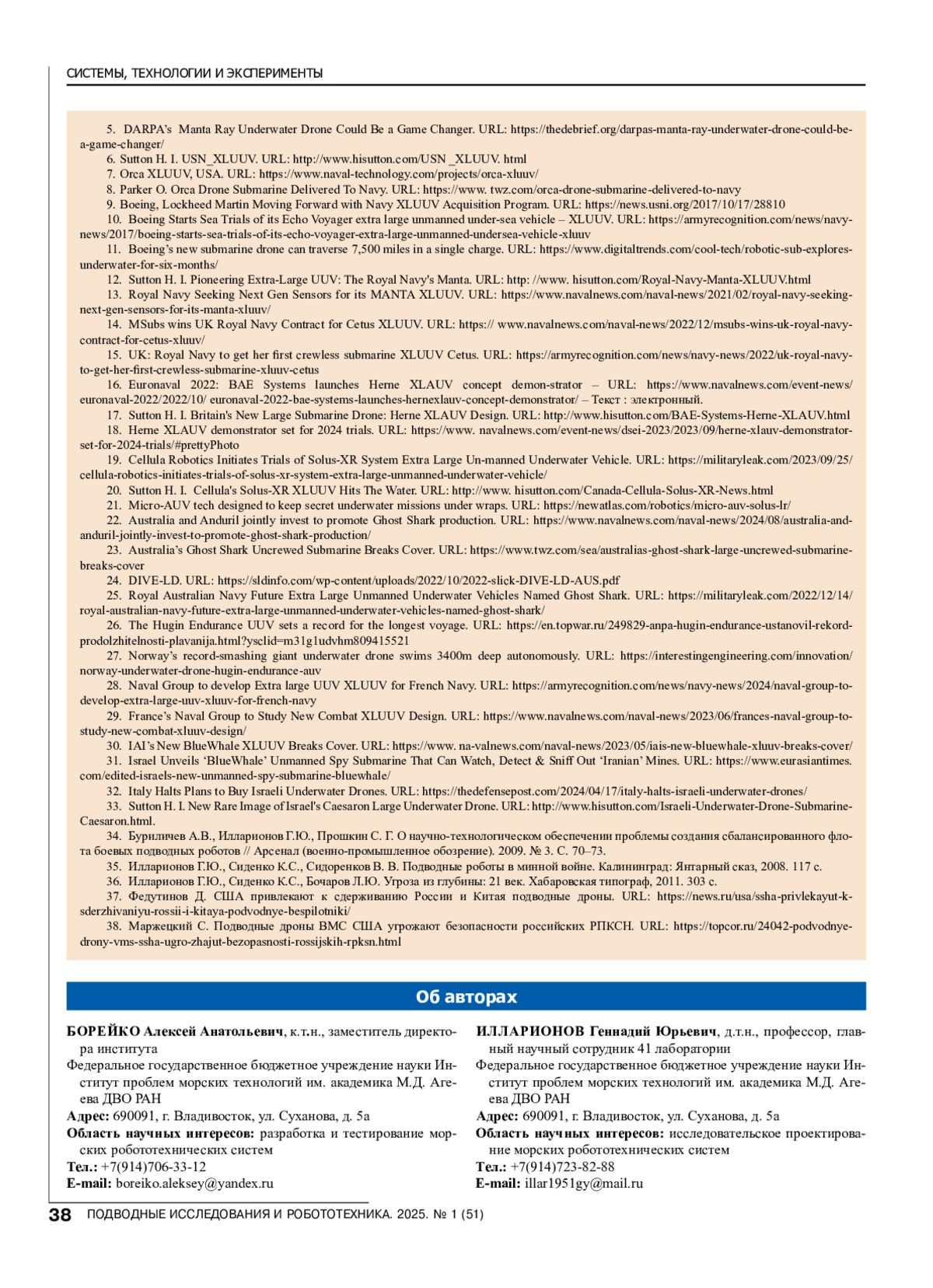 34. Буриличев А.В., Илларионов Г.Ю., Прошкин С.Г. О научно-технологическом обеспечении проблемы создания сбалансированного флота боевых подводных роботов // Арсенал (военно-промышленное обозрение). 2009. № 3. С. 70-73.