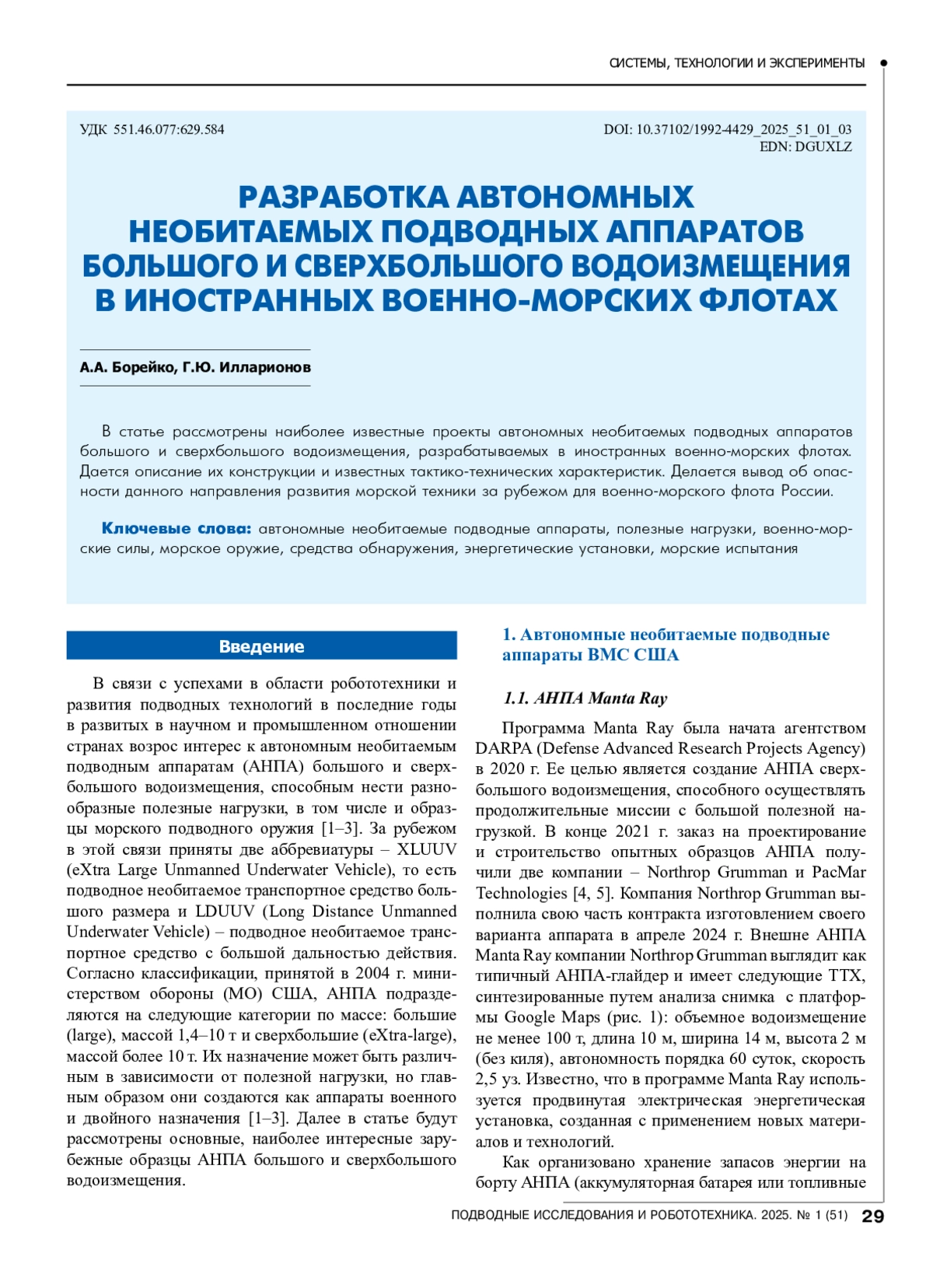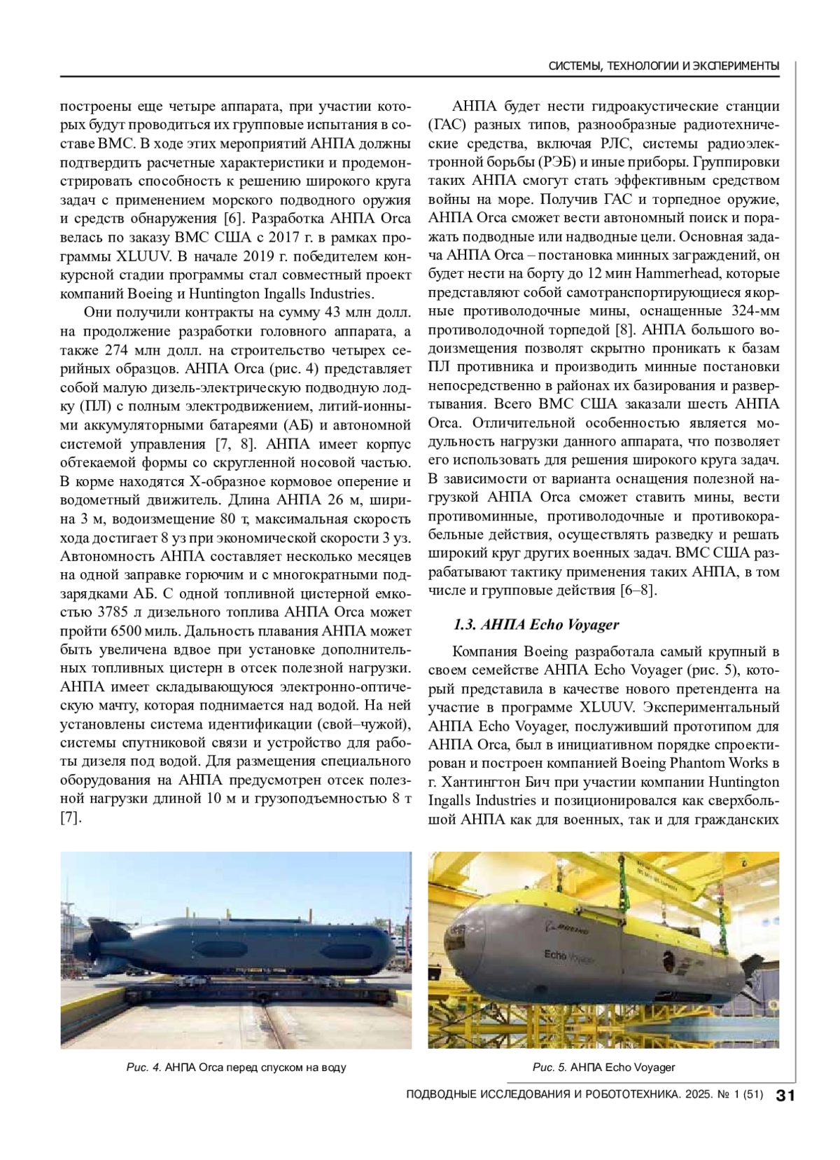 В связи с успехами в области робототехники и развития подводных технологий в последние годы в развитых в научном и промышленном отношении странах возрос интерес к автономным необитаемым подводным аппаратам (АНПА) большого и сверхбольшого водоизмещения, способным нести разнообразные полезные нагрузки, в том числе и образцы морского подводного оружия [1–3]. За рубежом в этой связи приняты две аббревиатуры – XLUUV (eXtra Large Unmanned Underwater Vehicle), то есть подводное необитаемое транспортное средство большого размера и LDUUV (Long Distance Unmanned Underwater Vehicle) ‒ подводное необитаемое транспортное средство с большой дальностью действия. Согласно классификации, принятой в 2004 г. министерством обороны (МО) США, АНПА подразделяются на следующие категории по массе: большие (large), массой 1,4–10 т и сверхбольшие (eXtra-large), массой более 10 т. Их назначение может быть различным в зависимости от полезной нагрузки, но главным образом они создаются как аппараты военного и двойного назначения [1–3]. Далее в статье будут рассмотрены основные, наиболее интересные зарубежные образцы АНПА большого и сверхбольшого водоизмещения.