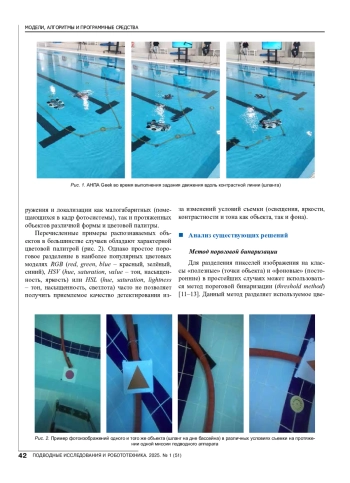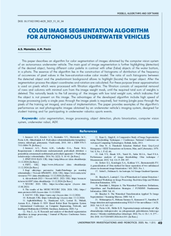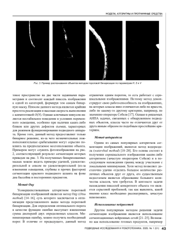 Несмотря на повсеместное применение искусственных нейронных сетей для решения задачи сегментации фотоизображений существуют области, где уместно применение классических подходов из теории распознавания образов. Примером может служить обработка фотоизображений с использованием слабых вычислительных ресурсов на процессорах с низким потреблением энергии и небольшим выделением тепла. Подобные условия часто возникают при создании мобильных робототехнических комплексов, например малогабаритных автономных необитаемых подводных аппаратов (АНПА) [1, 2].