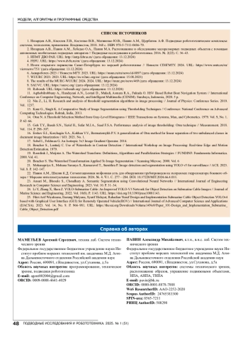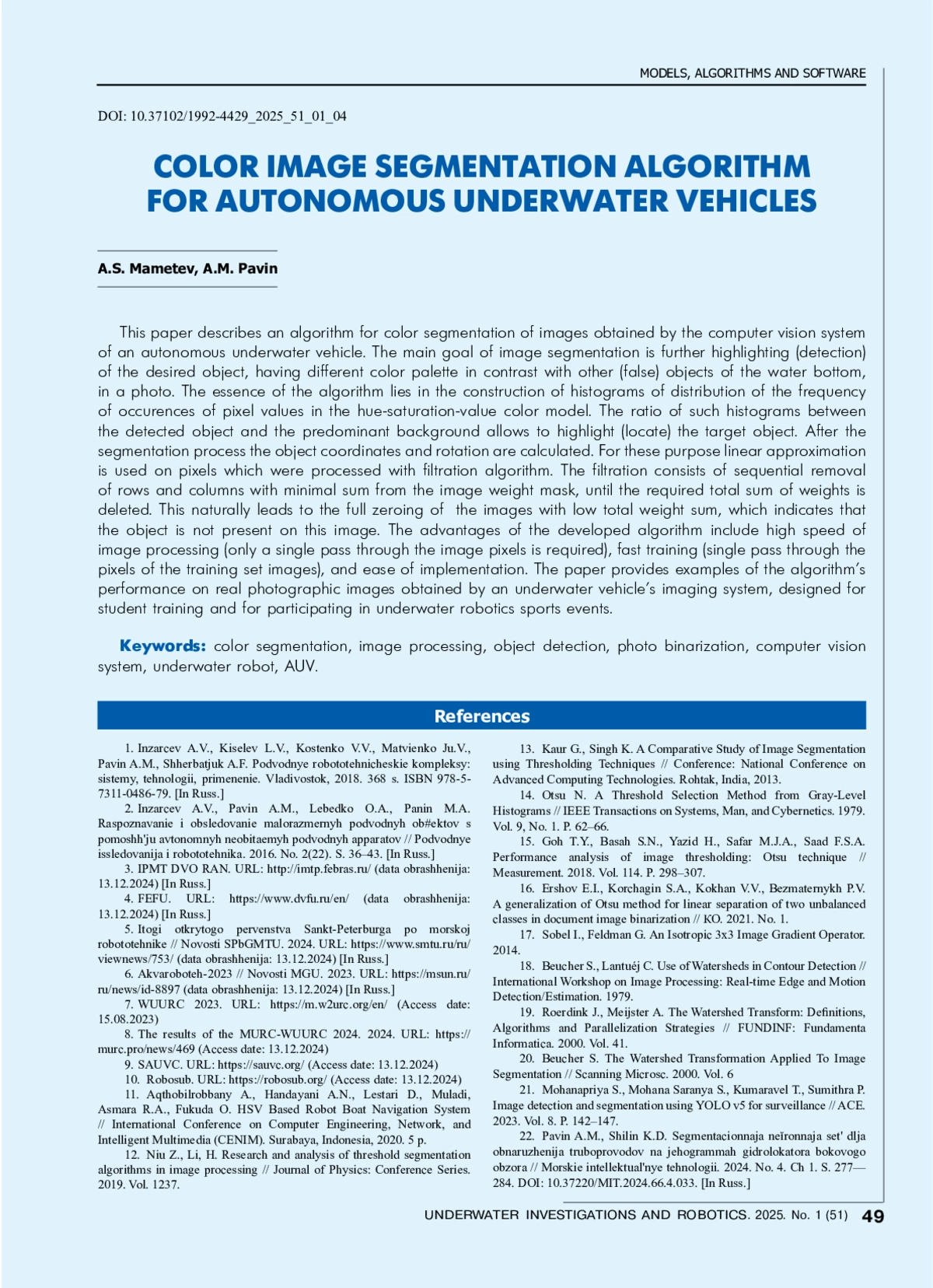 2. 	Инзарцев А.В., Павин А.М., Лебедко О.А., Панин М.А. Распознавание и обследование малоразмерных подводных объектов с помощью автономных необитаемых подводных аппаратов // Подводные исследования и робототехника. 2016. №. 2(22). С. 36-43.