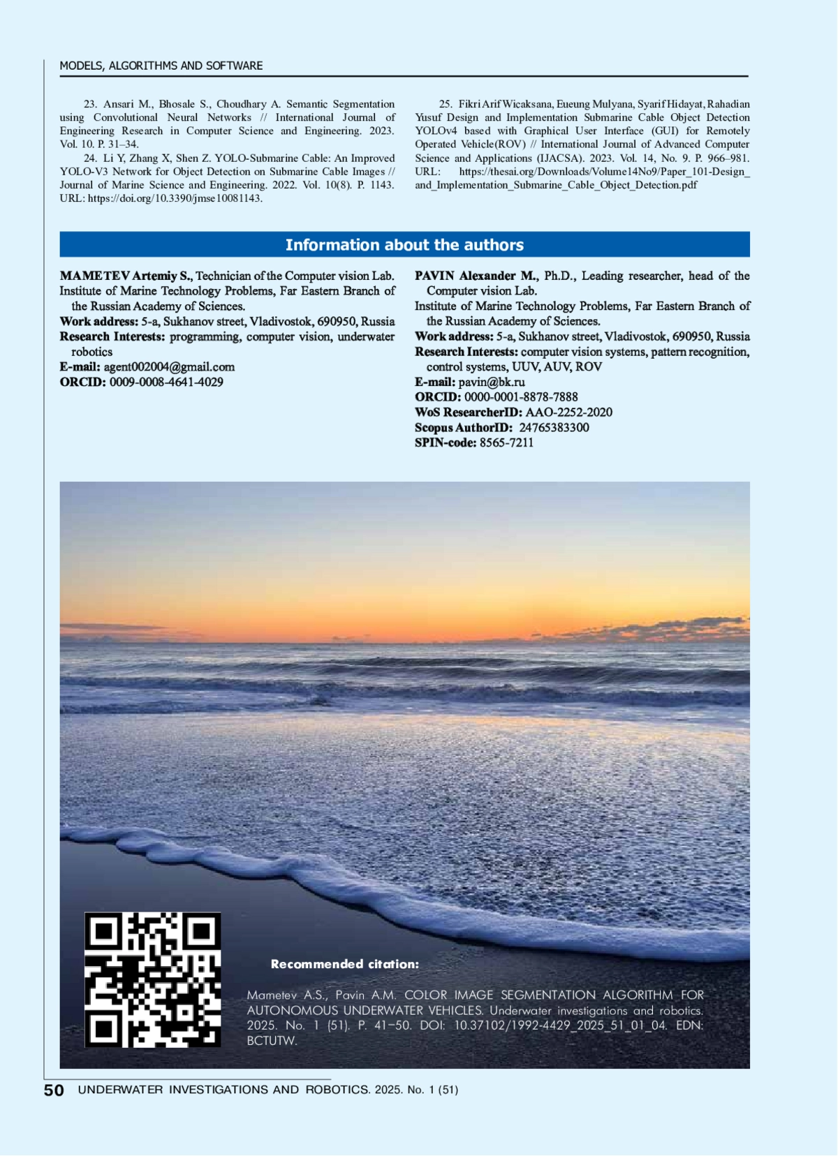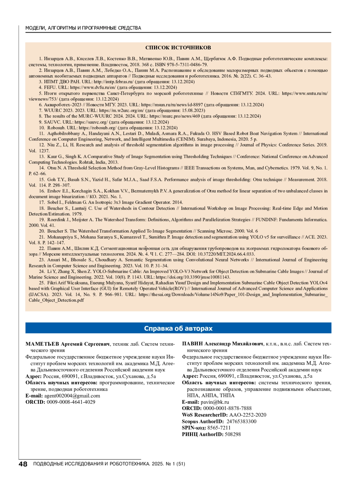 22. 	Павин А.М., Шилин К.Д. Сегментационная нейронная сеть для обнаружения трубопроводов на эхограммах гидролокатора бокового обзора // Морские интеллектуальные технологии. 2024. №. 4. Ч 1. С. 277-284. DOI: 10.37220/MIT.2024.66.4.033