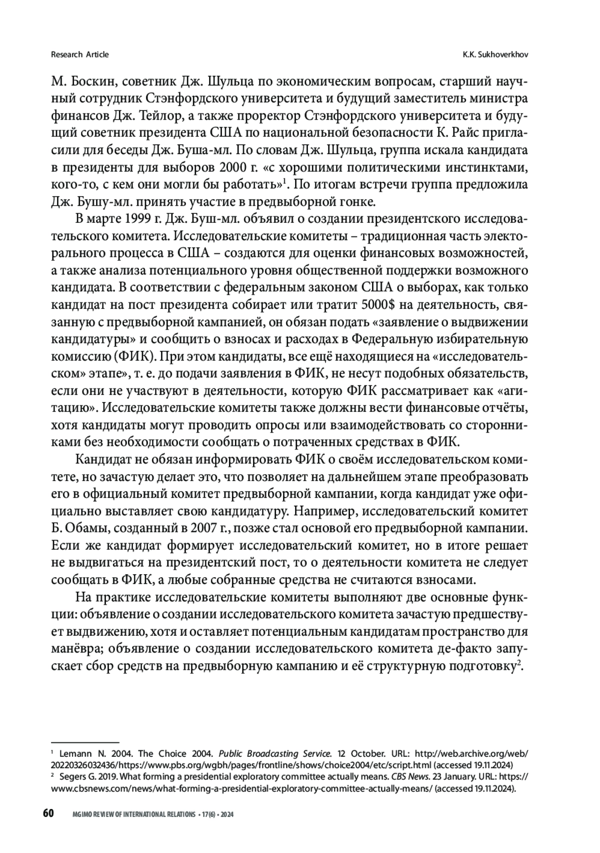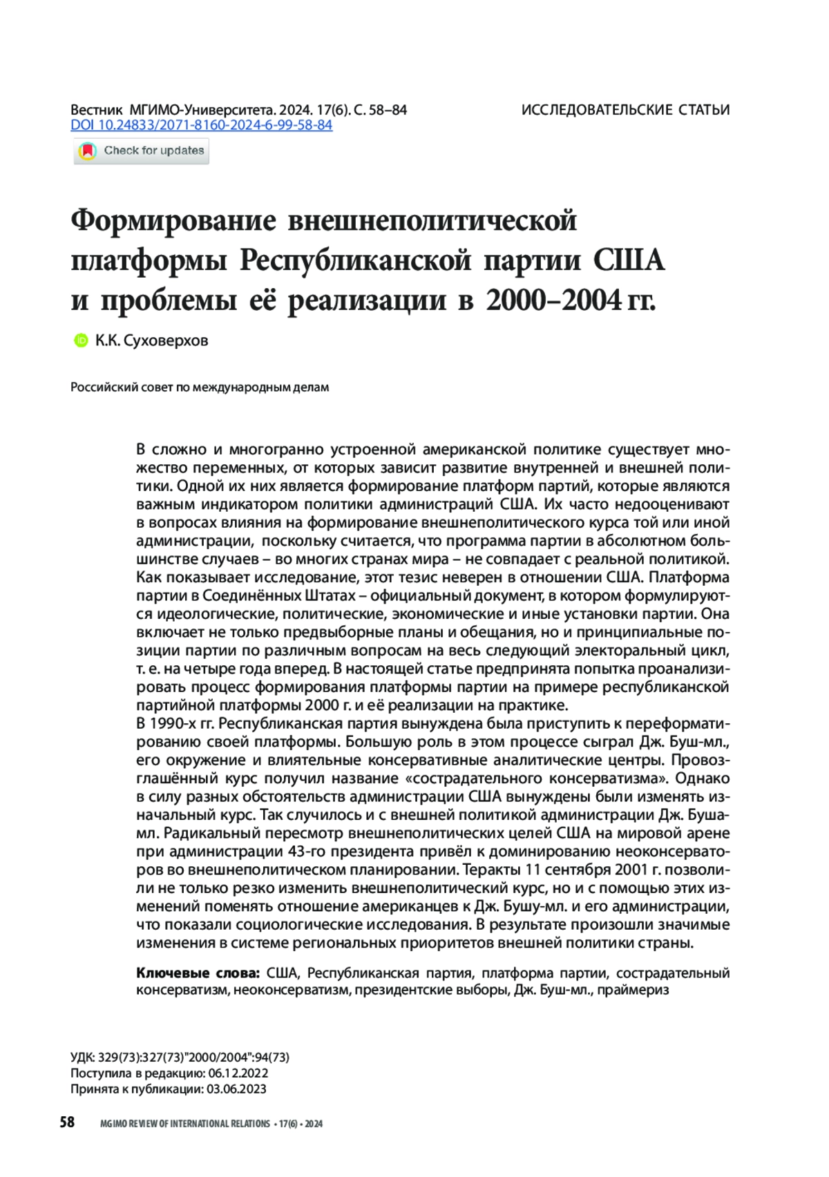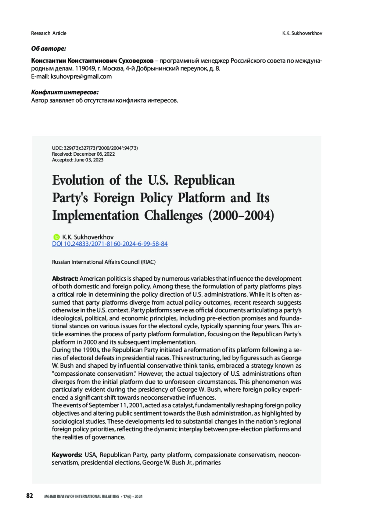 В сложно и многогранно устроенной американской политике существует множество переменных, от которых зависит развитие внутренней и внешней политики. Одной их них является формирование платформ партий, которые являются важным индикатором политики администраций США. Их часто недооценивают в вопросах влияния на формирование внешнеполитического курса той или иной администрации, поскольку считается, что программа партии в абсолютном большинстве случаев – во многих странах мира – не совпадает с реальной политикой. Как показывает исследование, этот тезис неверен в отношении США. Платформа партии в Соединённых Штатах – официальный документ, в котором формулируются идеологические, политические, экономические и иные установки партии. Она включает не только предвыборные планы и обещания, но и принципиальные позиции партии по различным вопросам на весь следующий электоральный цикл, т. е. на четыре года вперед. В настоящей статье предпринята попытка проанализировать процесс формирования платформы партии на примере республиканской партийной платформы 2000 г. и её реализации на практике.