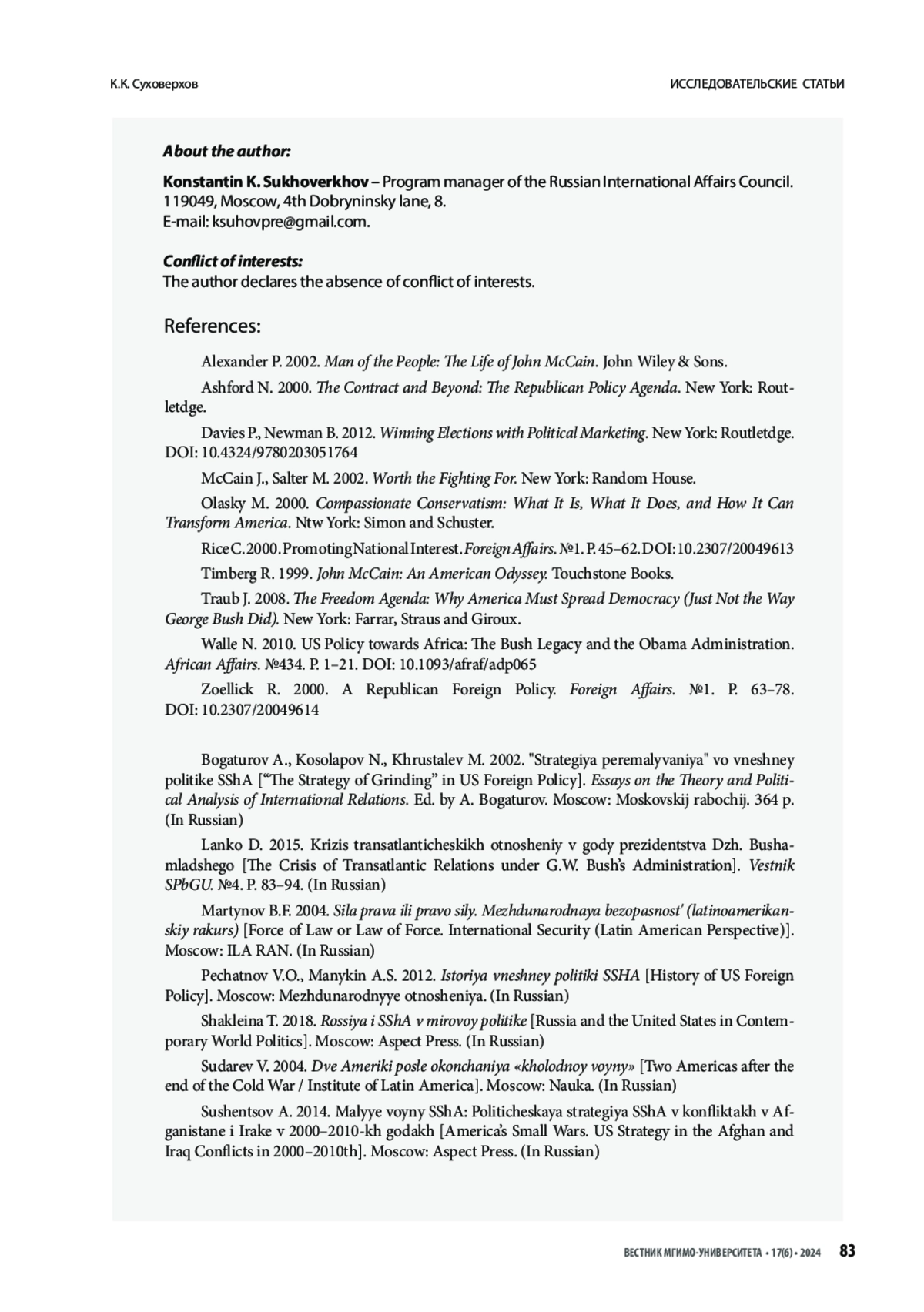 6. Rice C. 2000. Promoting National Interest. Foreign Affairs. 1. P. 45-62. https://doi.org/10.2307/20049613 Timberg R. 1999. John McCain: An American Odyssey. Touchstone Books.