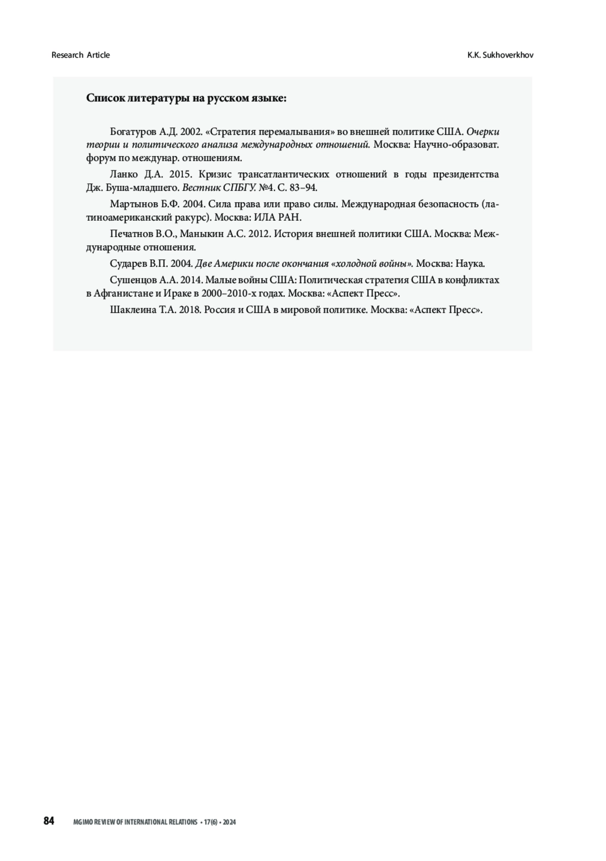 11. Ланко Д.А. 2015. Кризис трансатлантических отношений в годы президентства Дж. Буша-младшего. Вестник СПБГУ. № 4. С. 83-94.