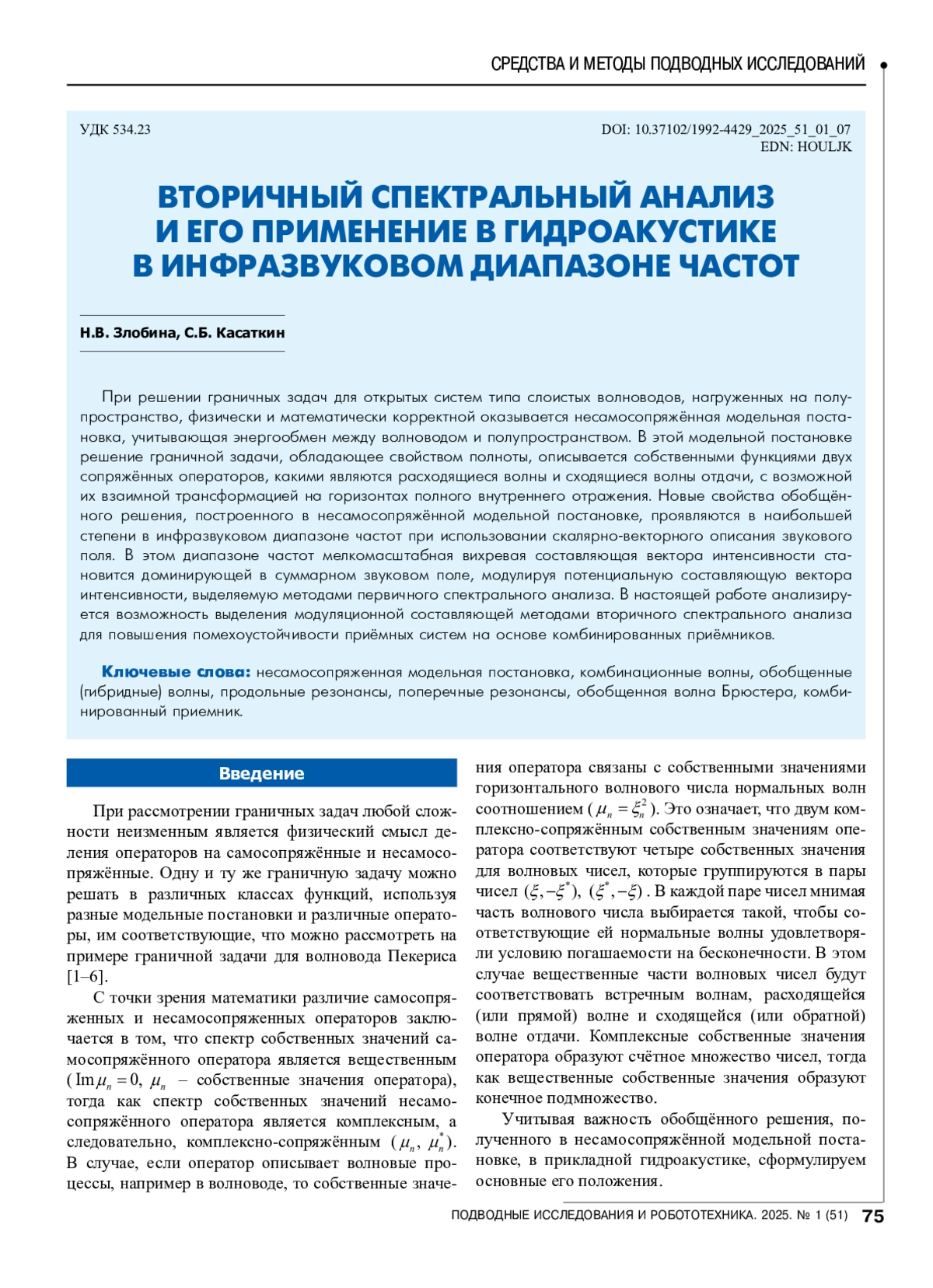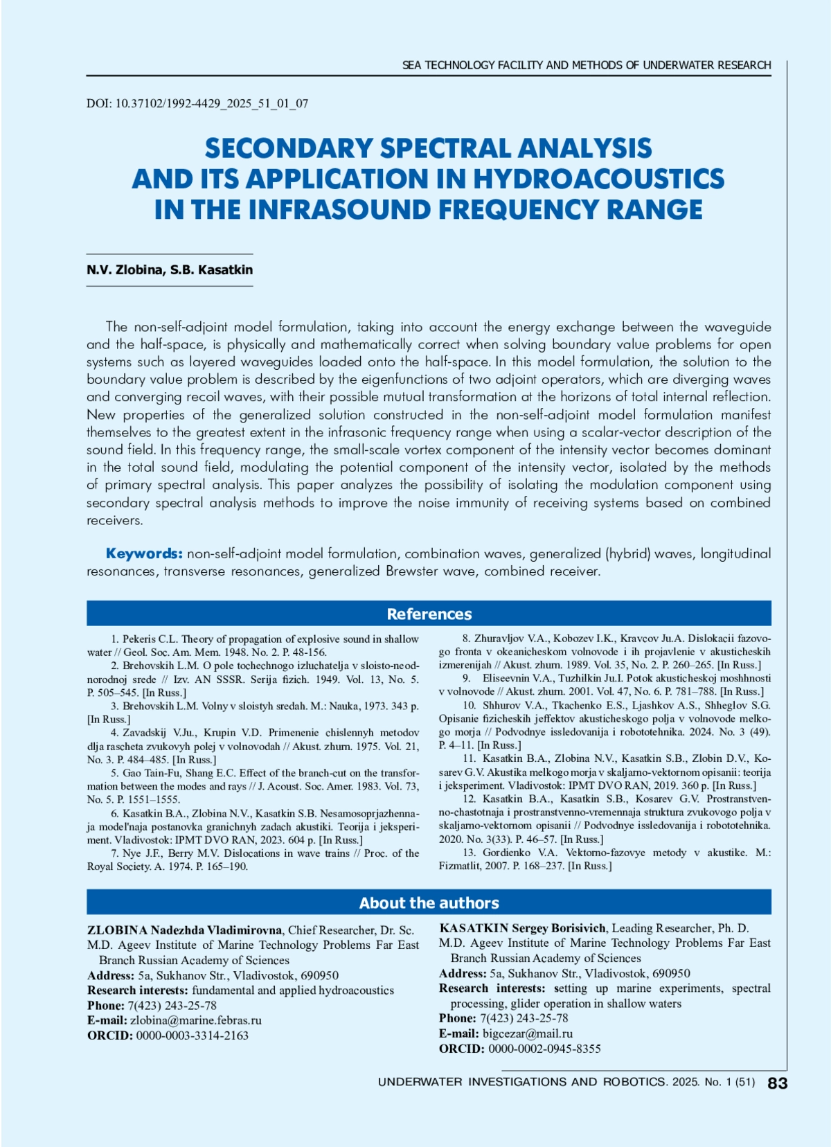 При решении граничных задач для открытых систем типа слоистых волноводов, нагруженных на полупространство, физически и математически корректной оказывается несамосопряжённая модельная постановка, учитывающая энергообмен между волноводом и полупространством. В этой модельной постановке решение граничной задачи, обладающее свойством полноты, описывается собственными функциями двух сопряжённых операторов, какими являются расходящиеся волны и сходящиеся волны отдачи, с возможной их взаимной трансформацией на горизонтах полного внутреннего отражения. Новые свойства обобщённого решения, построенного в несамосопряжённой модельной постановке, проявляются в наибольшей степени в инфразвуковом диапазоне частот при использовании скалярно-векторного описания звукового поля. В этом диапазоне частот мелкомасштабная вихревая составляющая вектора интенсивности становится доминирующей в суммарном звуковом поле, модулируя потенциальную составляющую вектора интенсивности, выделяемую методами первичного спектрального анализа. В настоящей работе анализируется возможность выделения модуляционной составляющей методами вторичного спектрального анализа для повышения помехоустойчивости приёмных систем на основе комбинированных приёмников.
