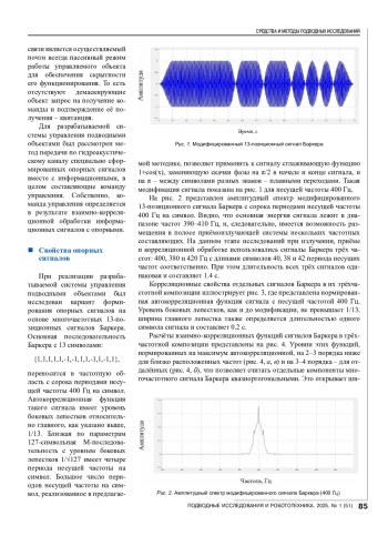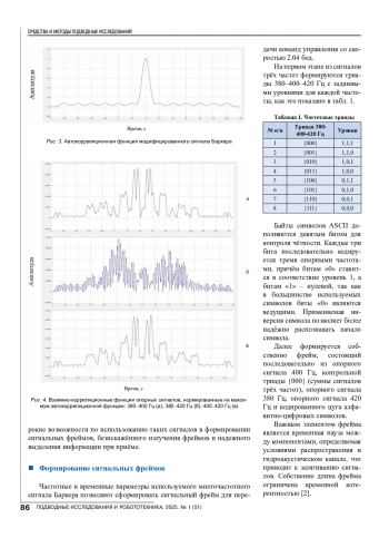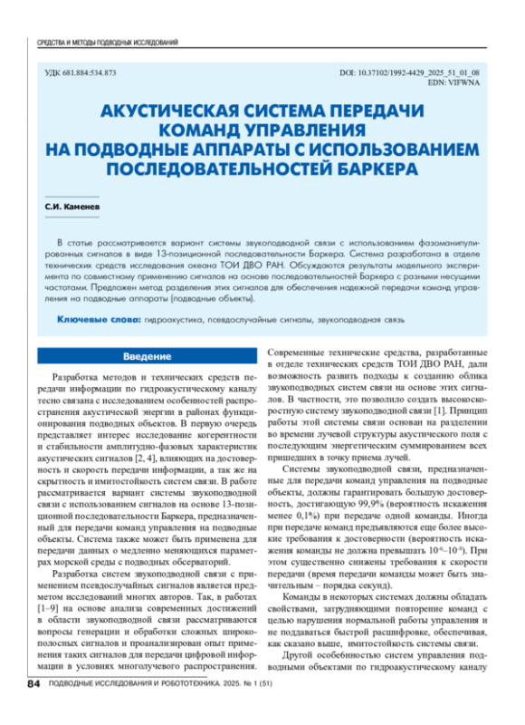Разработка методов и технических средств передачи информации по гидроакустическому каналу тесно связана с исследованием особенностей распространения акустической энергии в районах функционирования подводных объектов. В первую очередь представляет интерес исследование когерентности и стабильности амплитудно-фазовых характеристик акустических сигналов [2, 4], влияющих на достоверность и скорость передачи информации, а так же на скрытность и имитостойкость систем связи. В работе рассматривается вариант системы звукоподводной связи с использованием сигналов на основе 13-позиционной последовательности Баркера, предназначенный для передачи команд управления на подводные объекты. Система также может быть применена для передачи данных о медленно меняющихся параметрах морской среды с подводных обсерваторий.