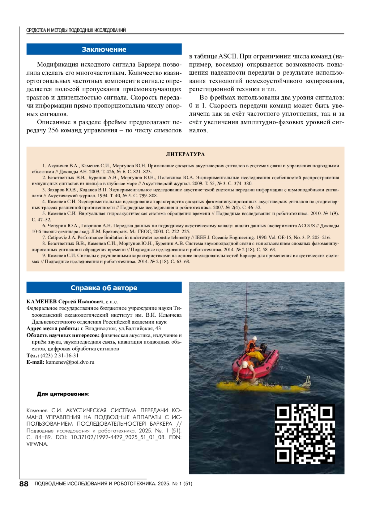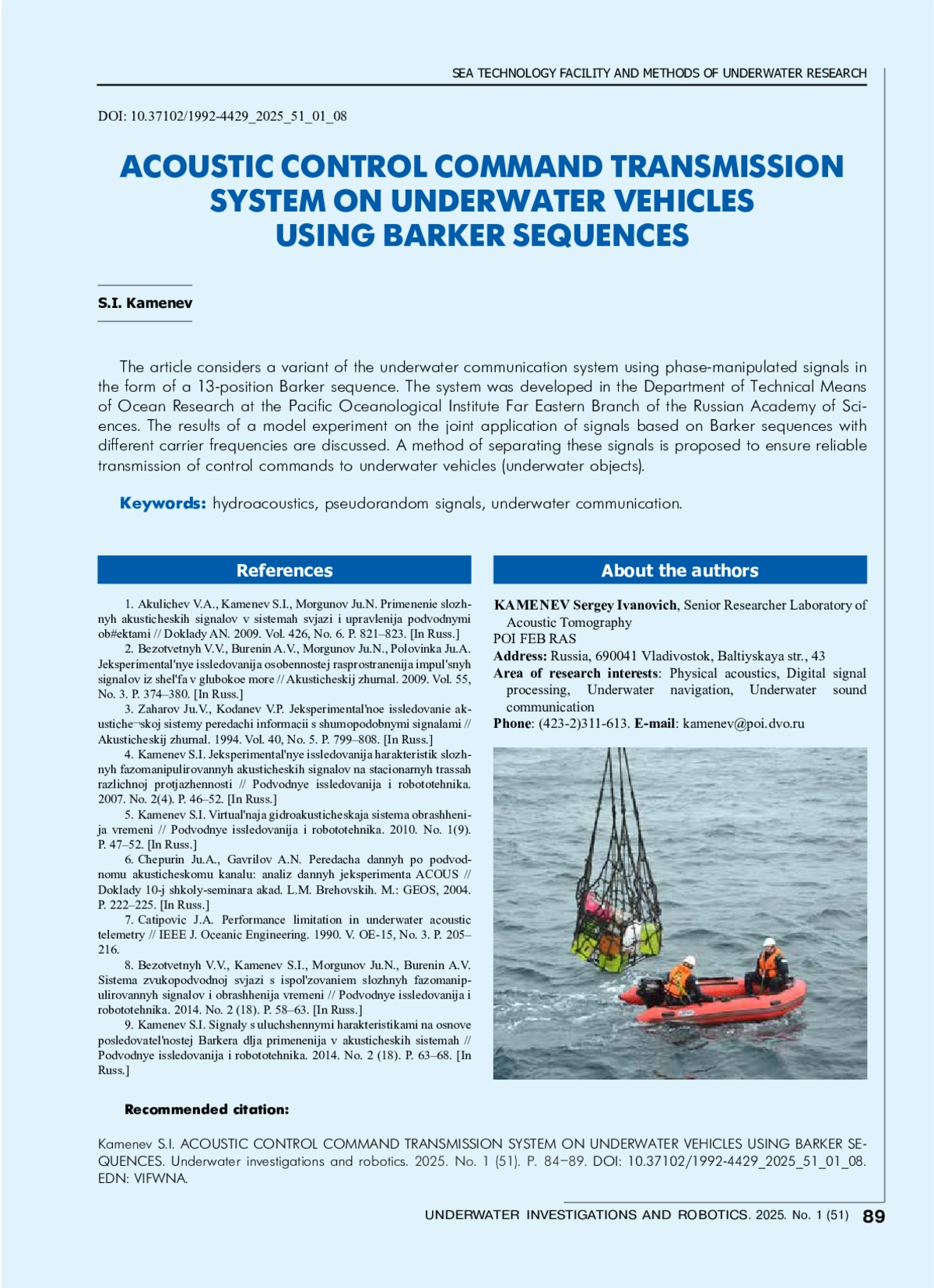 4. Каменев С.И. Экспериментальные исследования характеристик сложных фазоманипулированных акустических сигналов на стационарных трассах различной протяженности // Подводные исследования и робототехника. 2007. № 2(4). С. 46-52.