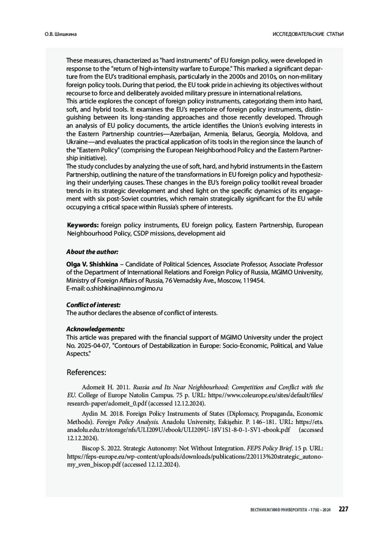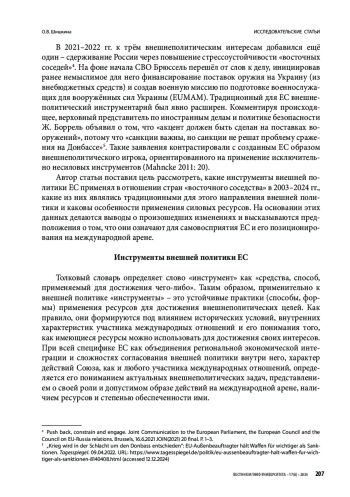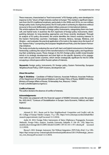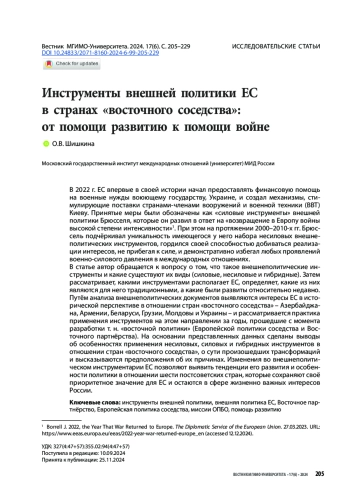 В статье автор обращается к вопросу о том, что такое внешнеполитические инструменты и какие существуют их виды (силовые, несиловые и гибридные). Затем рассматривает, какими инструментами располагает ЕС, определяет, какие из них являются для него традиционными, а какие были развиты относительно недавно. Путём анализа внешнеполитических документов выявляются интересы ЕС в исторической перспективе в отношении стран «восточного соседства» – Азербайджана, Армении, Беларуси, Грузии, Молдовы и Украины – и рассматривается практика применения инструментов на этом направлении за годы, прошедшие с момента разработки т. н. «восточной политики» (Европейской политики соседства и Восточного партнёрства). На основании представленных данных сделаны выводы об особенностях применения несиловых, силовых и гибридных инструментов в отношении стран «восточного соседства», о сути произошедших трансформаций и высказываются предположения об их причинах. Изменения во внешнеполитическом инструментарии ЕС позволяют выявить тенденции его развития и особенности политики в отношении шести постсоветских стран, которые сохраняют своё приоритетное значение для ЕС и остаются в сфере жизненно важных интересов России.