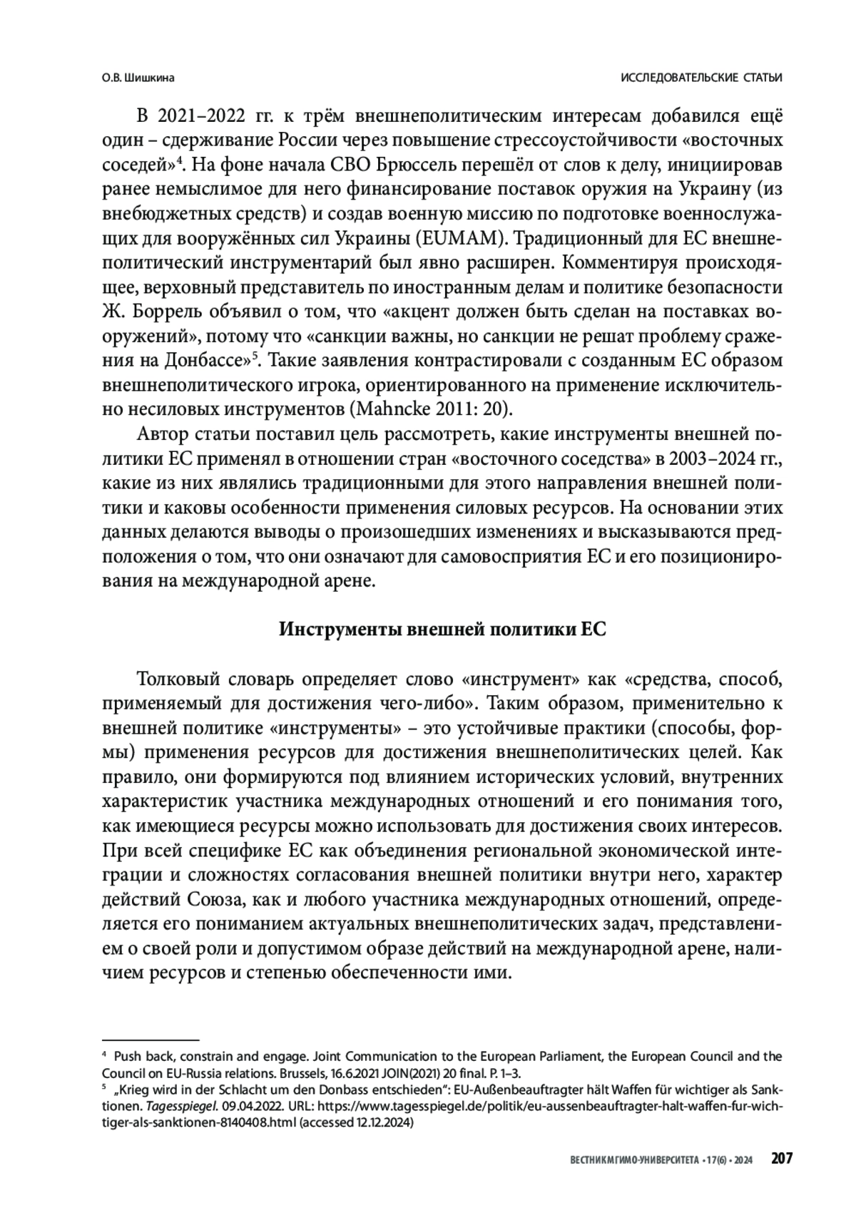 В 2022 г. ЕС впервые в своей истории начал предоставлять финансовую помощь на военные нужды воюющему государству, Украине, и создал механизмы, стимулирующие поставки странами-членами вооружений и военной техники (ВВТ) Киеву. Принятые меры были обозначены как «силовые инструменты» внешней политики Брюсселя, которые он развил в ответ на «возвращение в Европу войны высокой степени интенсивности». При этом на протяжении 2000–2010-х гг. Брюссель подчёркивал уникальность имеющегося у него набора несиловых внешнеполитических инструментов, гордился своей способностью добиваться реализации интересов, не прибегая к силе, и демонстративно избегал любых проявлений военно-силового давления в международных отношениях.
