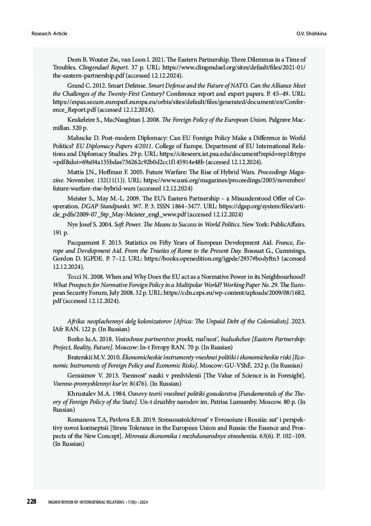 8. Mahncke D. Post-modern Diplomacy: Can EU Foreign Policy Make a Difference in World Politics? EU Diplomacy Papers 4/2011. College of Europe. Department of EU International Relations and Diplomacy Studies. 29 p. URL: https://citeseerx.ist.psu.edu/document?repid=rep1&type=pdf&doi=69a04a155bdae736262c92b0d2cc1f145914e48b (accessed 12.12.2024).