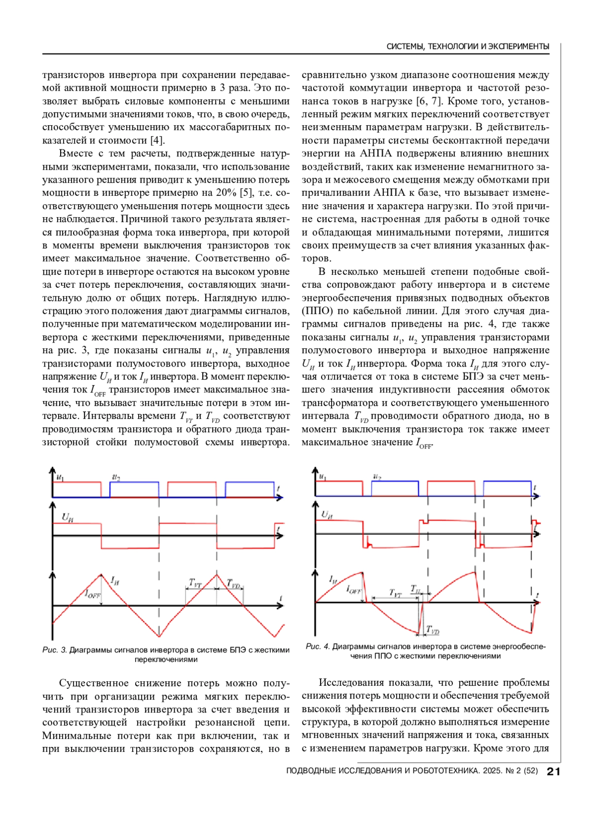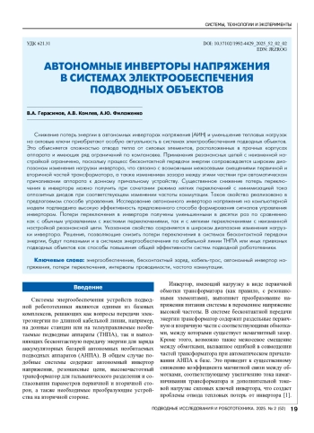 Снижение потерь энергии в автономных инверторах напряжения (АИН) и уменьшение тепловых нагрузок на силовые ключи приобретают особую актуальность в системах электрообеспечения подводных объектов. Это объясняется сложностью отвода тепла от силовых элементов, расположенных в прочных корпусах аппарата и имеющих ряд ограничений по компоновке. Применения резонансных цепей с неизменной настройкой ограничено, поскольку процесс бесконтактной передачи энергии сопровождается широким диапазоном изменения нагрузки инвертора, что связано с возможными межосевыми смещениями первичной и вторичной частей трансформатора, а также изменением зазора между этими частями при автоматическом причаливании аппарата к донному причальному устройству. Существенное снижение потерь переключения в инверторе можно получить при сочетании режима мягких переключений с минимизацией тока оппозитных диодов при соответствующем изменении частоты коммутации. Такое свойство реализовано в предлагаемом способе управления. Исследование автономного инвертора напряжения на компьютерной модели подтвердило высокую эффективность предложенного способа формирования сигналов управления инвертором. Потери переключения в инверторе получены уменьшенными в десятки раз по сравнению как с обычным управлением с жесткими переключениями, так и с мягкими переключениями с неизменной настройкой резонансной цепи. Указанное свойство сохраняется в широком диапазоне изменения нагрузки инвертора. Решения, позволяющие снизить потери переключения в системах бесконтактной передачи энергии, будут полезными и в системах энергообеспечения по кабельной линии ТНПА или иных привязных подводных объектов как способы повышения общей эффективности систем подводной робототехники.